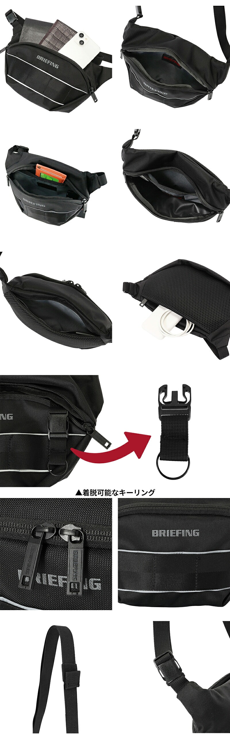 外内ポケットや着脱可能なキーリングで必要な物を整理でき、ウェビングテープを設けたことでカスタマイズ性も高めています。