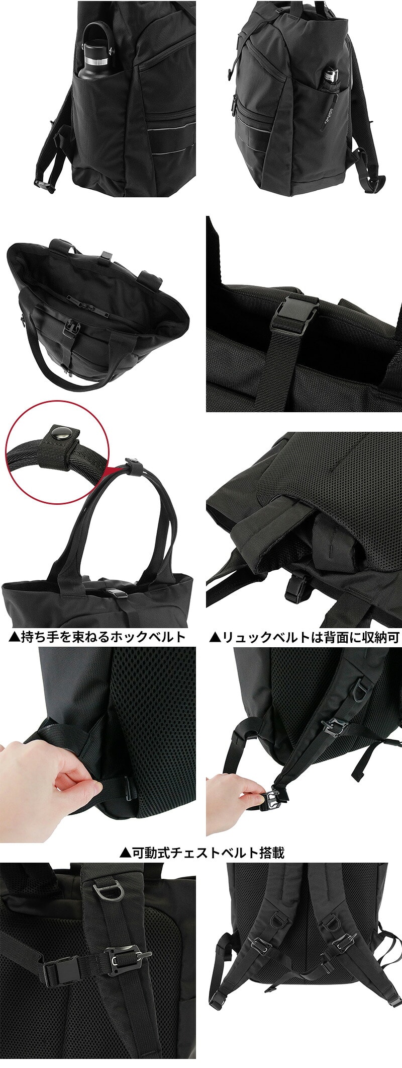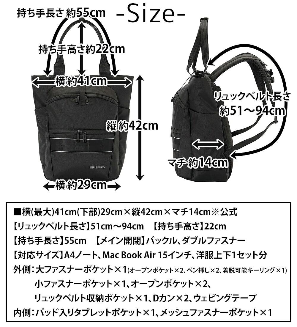 | サイズ(約) ※当店実寸値 | 公式サイズ 横(最大)41cm(下部)29cm×縦42cm×マチ14cm 【リュックベルト長さ】51cm~94cm 【持ち手高さ】22cm 【持ち手長さ】55cm 【対応サイズ】A4ノート、Mac Book Air 15インチ、洋服上下1セット分 | ||