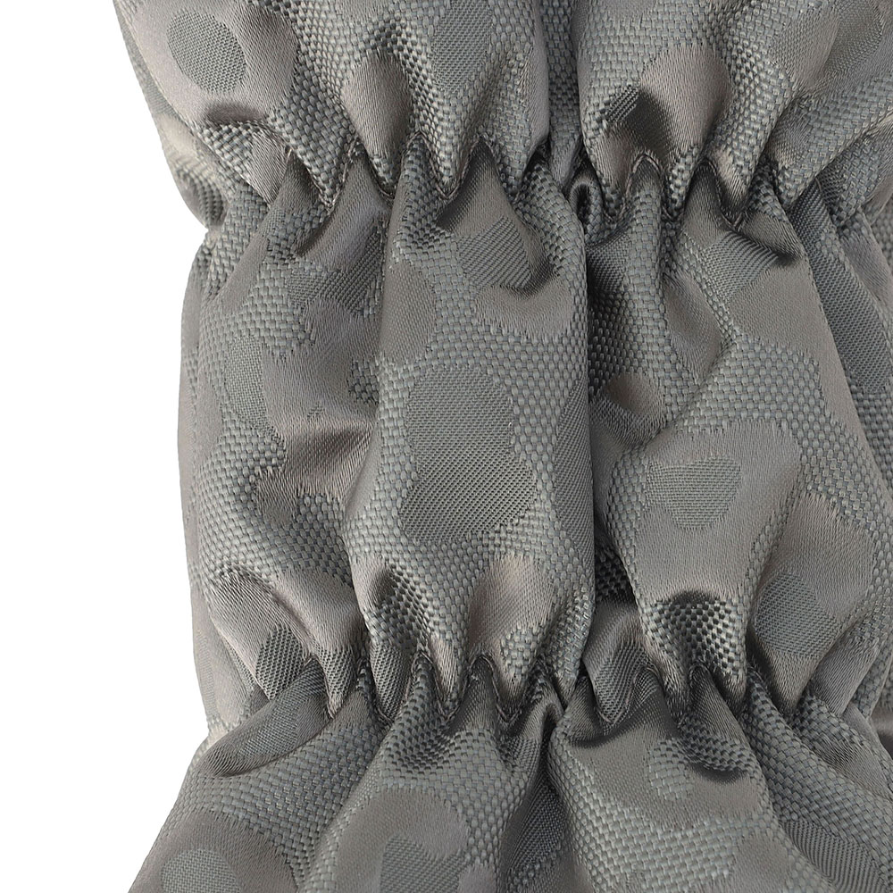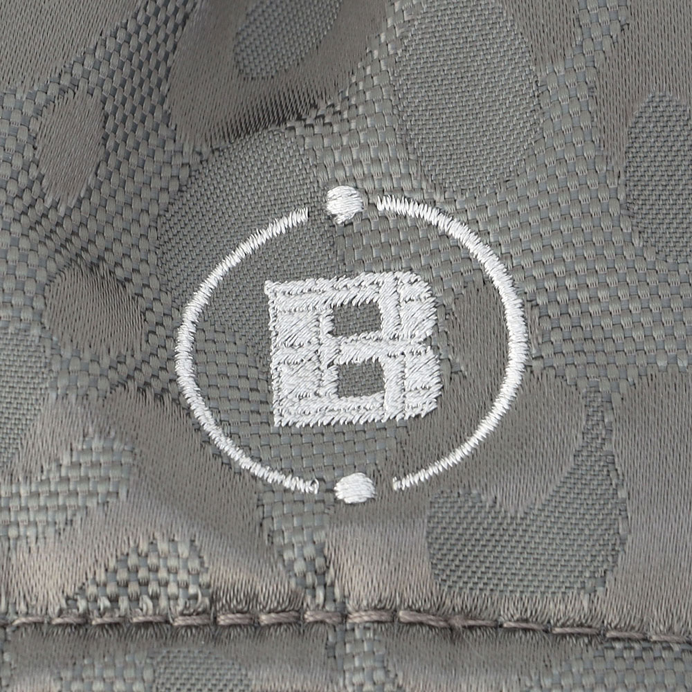 ・ロゴ刺繍には素材の風合いに合うシルバー色を採用し、格子風の柄が浮き出る特別な刺繍を装飾。