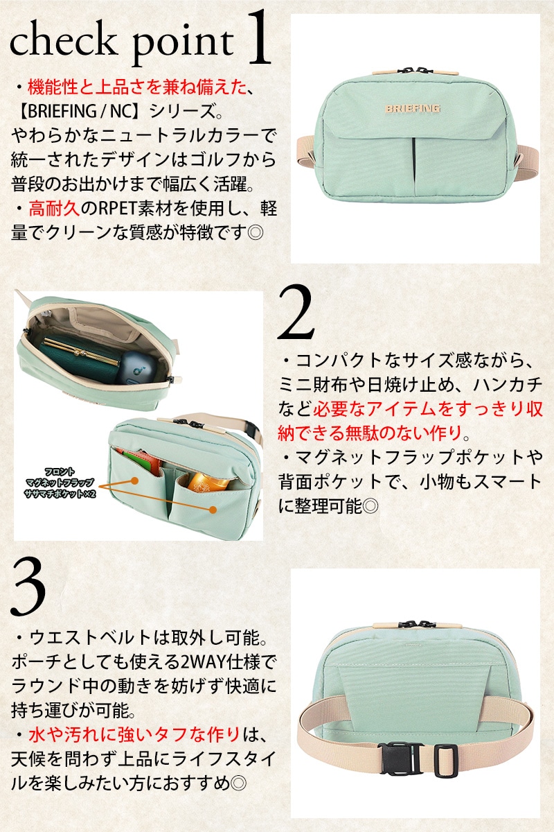 | 備考 | 【メイン開閉】ダブルファスナー 外側/ マグネットポケット×2 ミニオープンポケット×1 内側/ オープンポケット×1 ホールドパネル×1 付属/ ウエストベルト×1 ・ホールドパネルはスコアカード等を背面側に差し込んで固定可能 キーワード : 街歩きバッグ サブバッグ 旅行バッグ デイリーユース タウンユース 軽量 丈夫 コンパクトバッグ 小物収納 高校生 大学生 アウトドア 1万円台 小さめ 財布収納 スマホ収納 カードケース収納 A6対応 2WAY ウエストバッグ ボディバッグ 斜め掛け ポーチ メンズ レディース BRIEFING ブリーフィング NCシリーズ スクエアウエストポーチ カジュアル おしゃれ シンプル プレゼント ギフト ラッピング ラッピング無料 男性 女性 ビジネス 学生 ブランド ポイント消化 ニューバッグワカマツ ニューバックワカマツ | ||