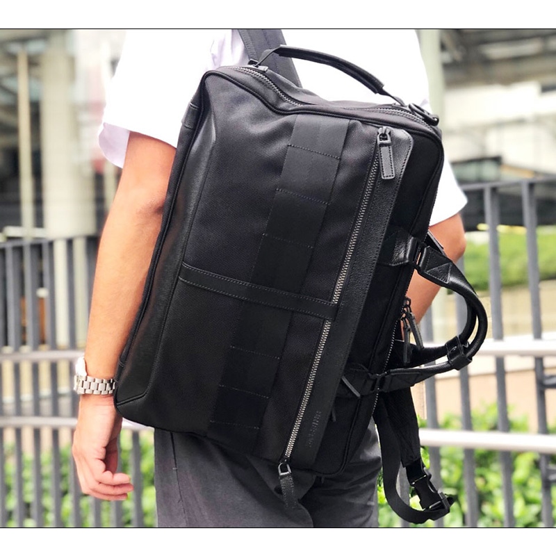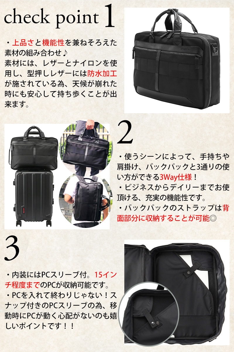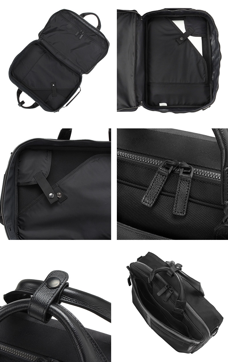 使うシーンによって、手持ち、肩掛け、バックパックと3通りの使い方ができる3Way仕様のビジネスバッグ。