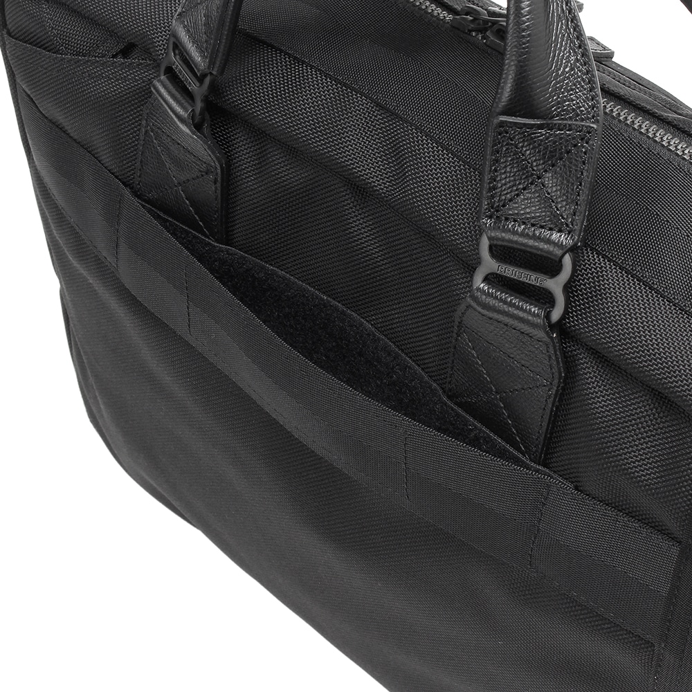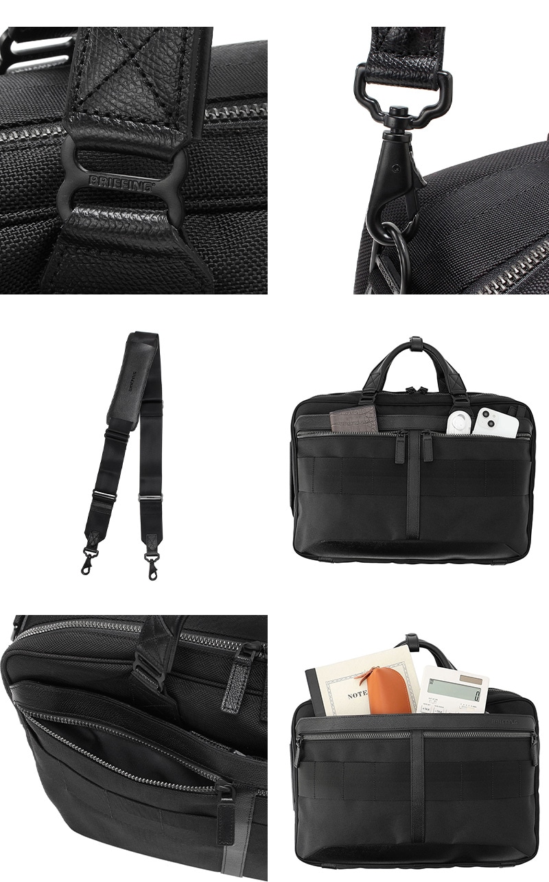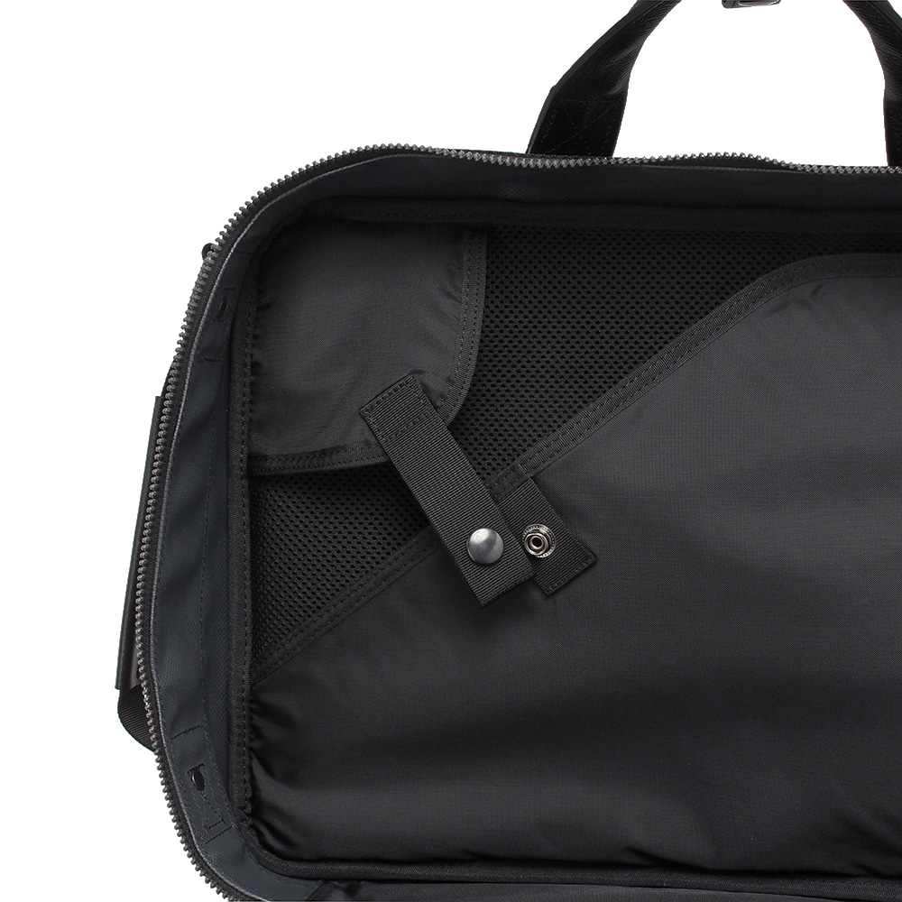 レザー×ナイロンを使用。BRIEFINGの代名詞でもあるレッドラインをあえて使用せず、ワントーンに纏めることで、異素材のコンビネーションが際立つ仕上がりに。