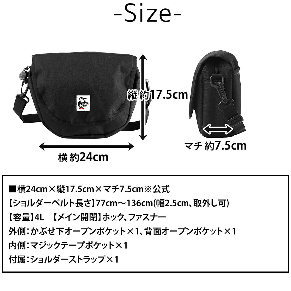 | サイズ(約) ※当店実寸値 | 公式サイズ 横24cm×縦17.5cm×マチ7.5cm 【ショルダーベルト長さ】77cm~136cm(幅2.5cm、取外し可) 【容量】4L | ||