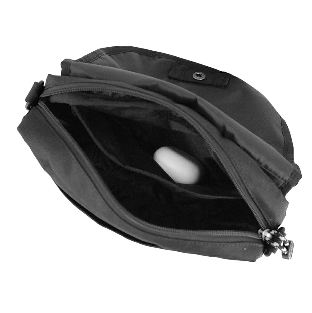 ホックで手軽に開閉でき、ファスナーでしっかり閉じられるため、防犯面にも配慮されたつくりで、旅行先や人混みでも安心して使えます。