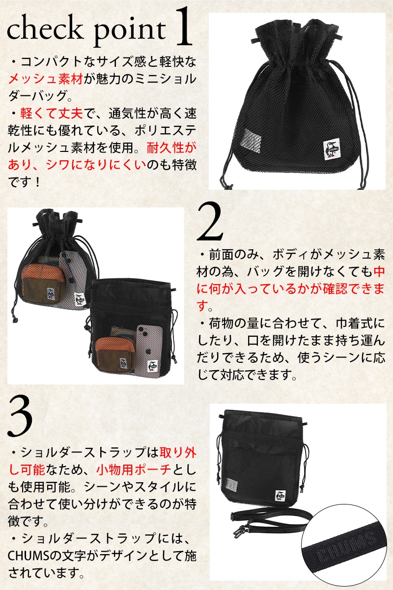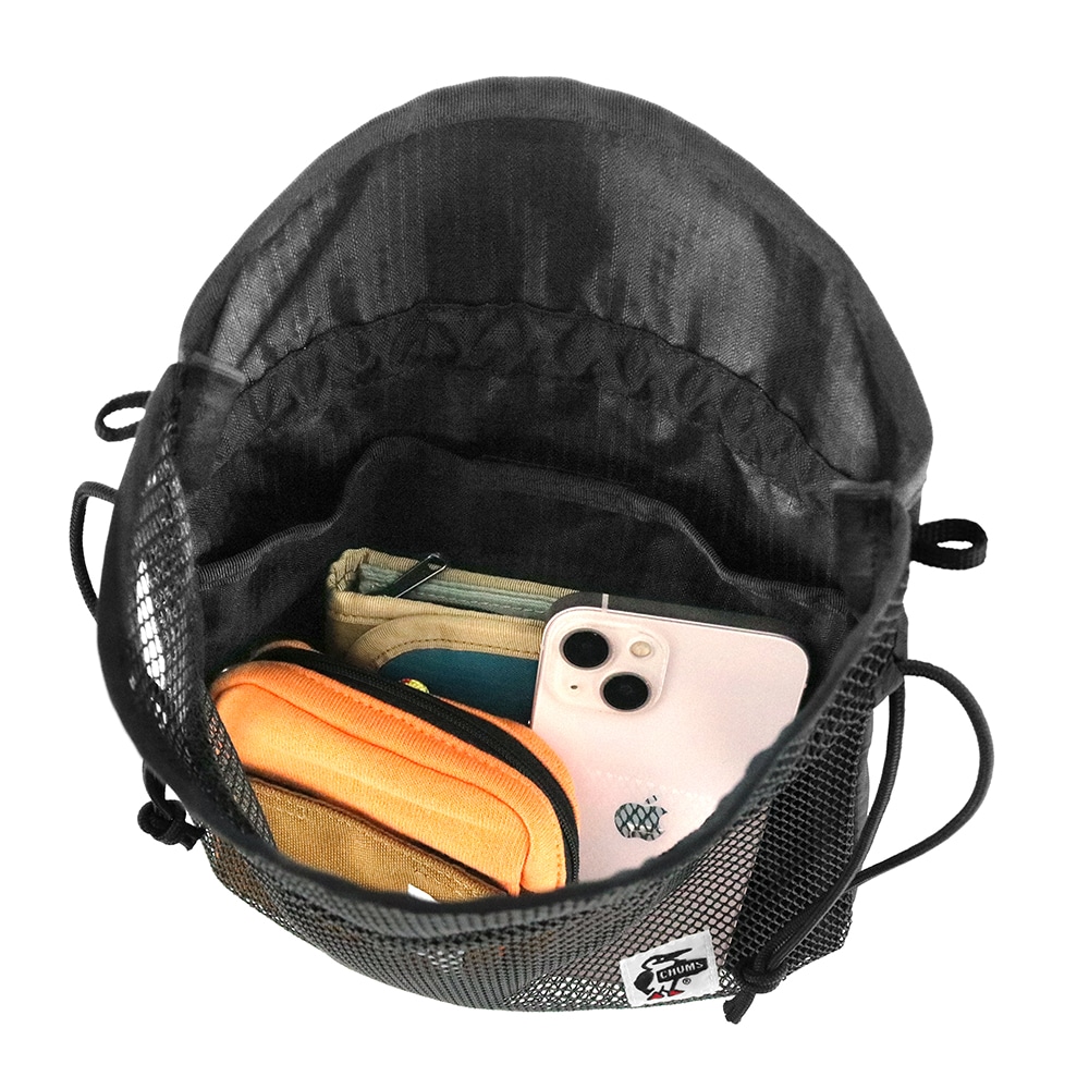 チャムス CHUMS ショルダー 肩がけ 3l A5 小さめ コンパクト 巾着 軽い 通勤 通学 人気 おしゃれ 旅行 海 プール 海水浴 フェス 黒 お出かけ ユニセックス スポーツ Mesh Mini Bag