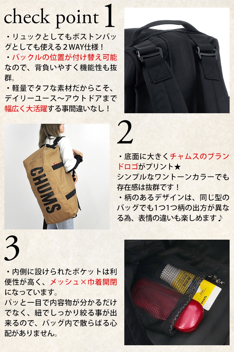 チャムス ボストンバッグ リュック 2WAY 人気 キャンプ グランピング 軽い 修学旅行 2泊 3泊 4泊 大容量 40L トレッキング 林間学校 旅行バッグ ユニセックス Recycle CHUMS 2WAY BOSTON