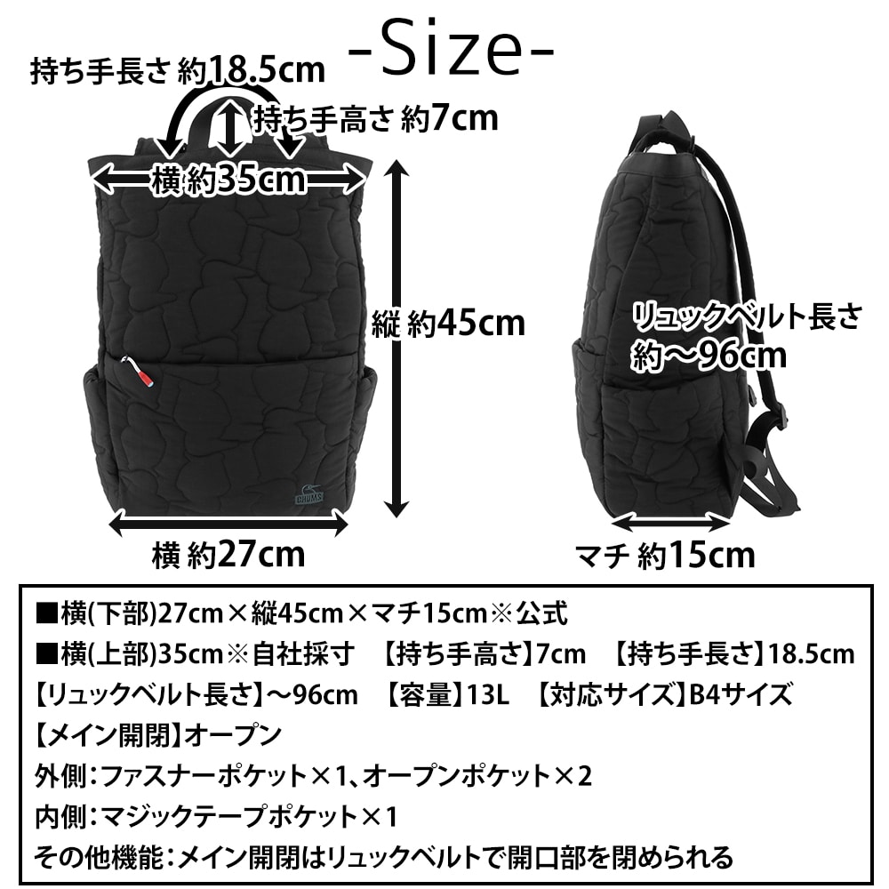 13L容量と普段使いにちょうど良く、B4サイズまでの書類やノートも収納可能なので学生やビジネスユーザーにもオススメ。