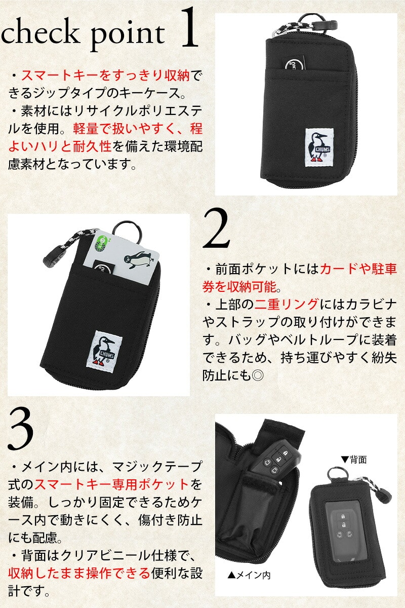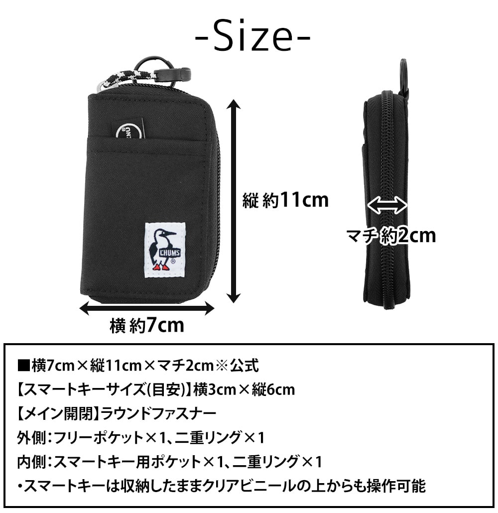 | 備考 | 【メイン開閉】ラウンドファスナー 外側/ フリーポケット×1 二重リング×1 内側/ スマートキー用ポケット×1 二重リング×1 ・スマートキーは収納したままクリアビニールの上からも操作可能 キーワード : チャムス キーケース スマートキーケース ラウンドファスナー カード収納 カラビナ対応 ストラップ対応 ポリエステル 小物入れ メンズ レディース ユニセックス コンパクト 軽量 カジュアル ストリート シンプル 柄 通勤 通学 旅行 アウトドア 普段使い 定番人気 5000円以下 プレゼント ギフト ラッピング ラッピング無料 学生 ブランド ポイント消化 ニューバッグワカマツ ニューバックワカマツ | ||