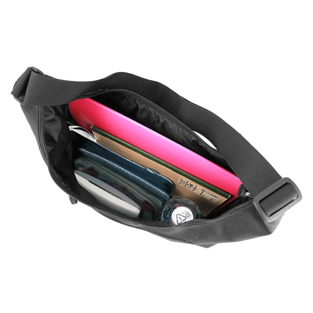 ダブルファスナーで大きく開き、500mlペットボトルやA4書類もスムーズに収納可能。