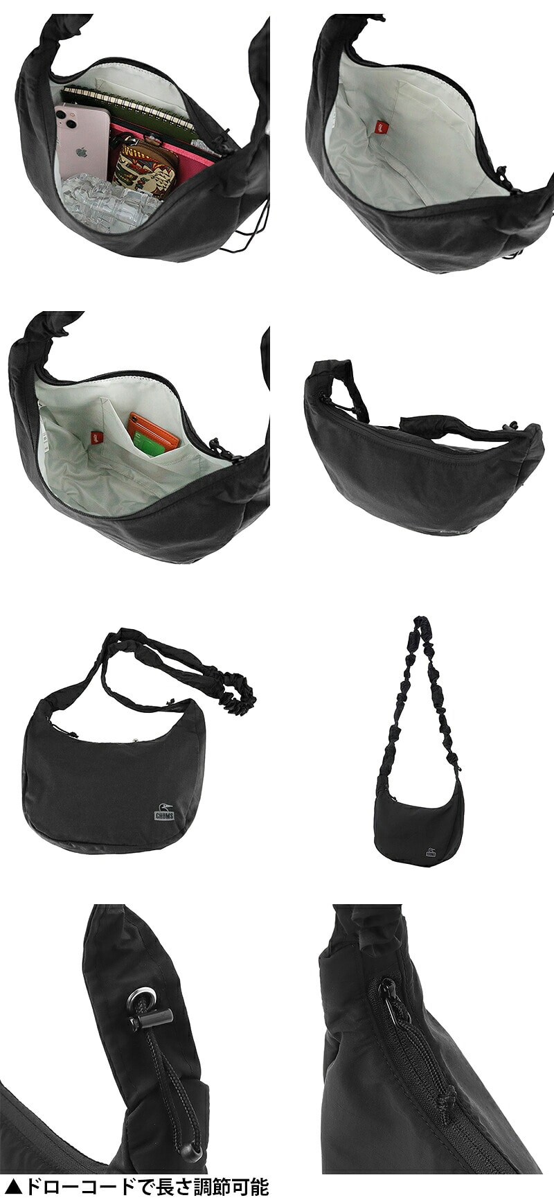 装飾を抑えたシンプルなデザインで幅広いスタイルに合わせやすく、ドローコードで長さを調節すれば肩掛け・斜め掛けとアレンジも可能。