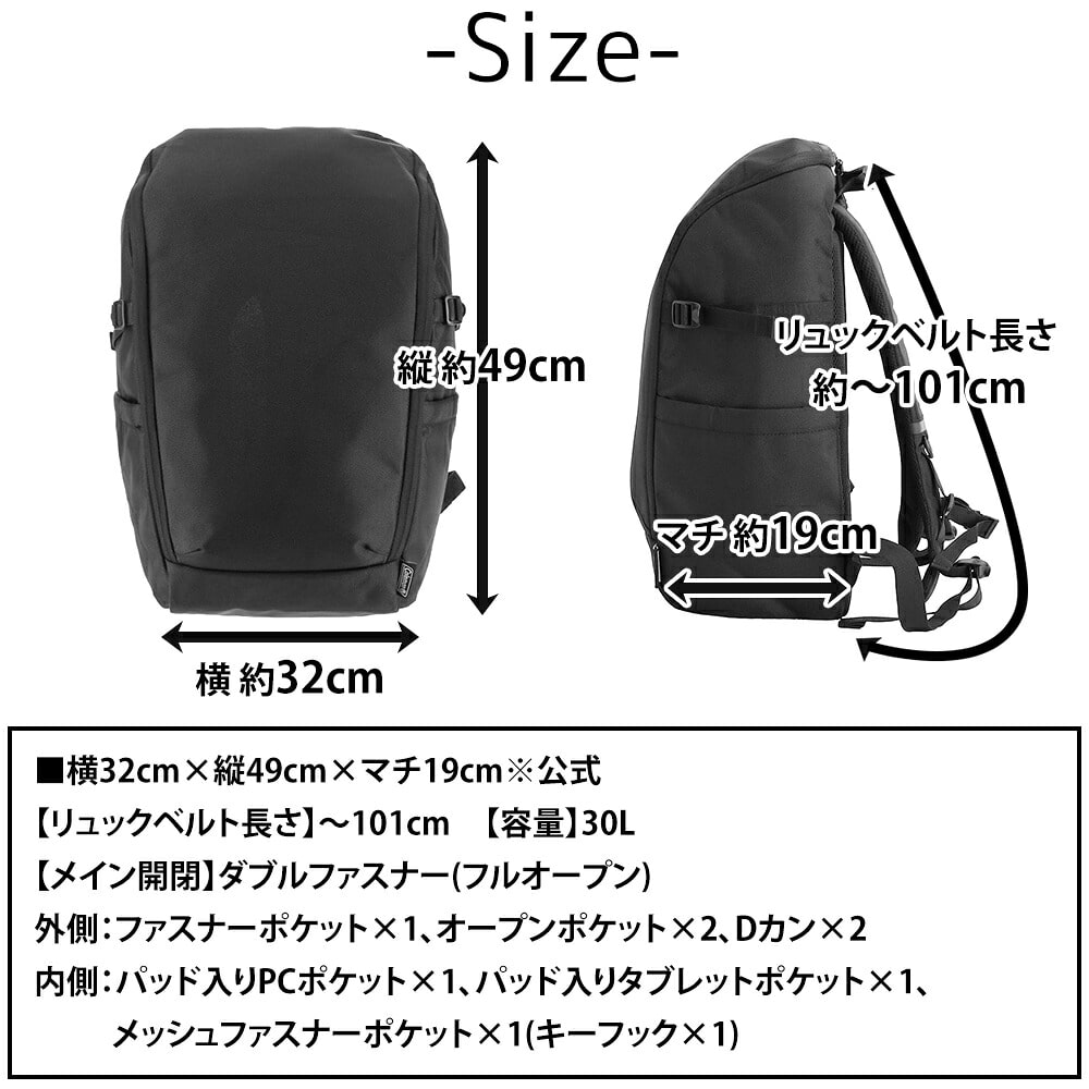 | サイズ(約) ※当店実寸値 | 公式サイズ 横32cm×縦49cm×マチ19cm 【リュックベルト長さ】~101cm 【容量】30L | ||