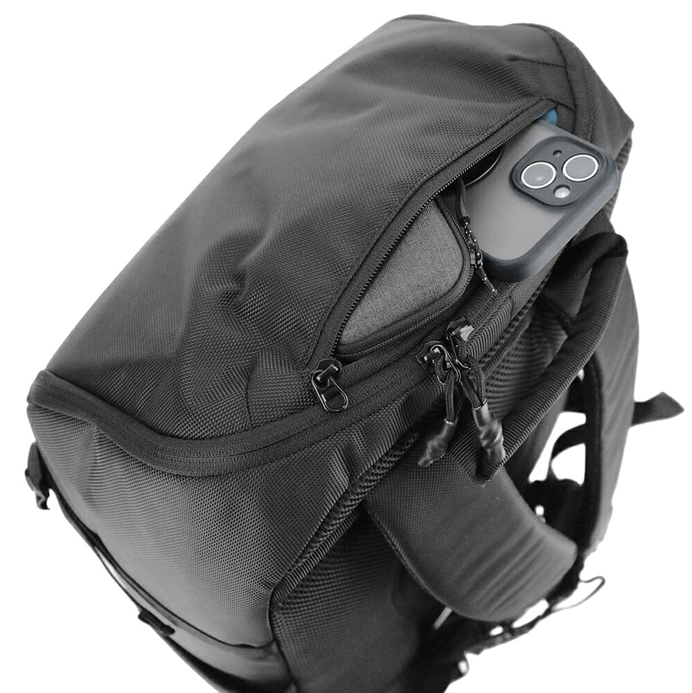 上部の浅めポケットは前持ちした際のスマホの出し入れにも便利。