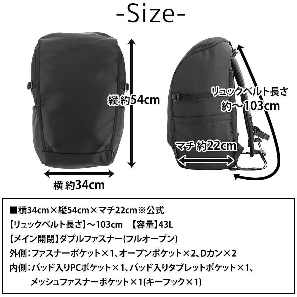 | サイズ(約) ※当店実寸値 | 公式サイズ 横34cm×縦54cm×マチ22cm 【リュックベルト長さ】~103cm 【容量】43L | ||