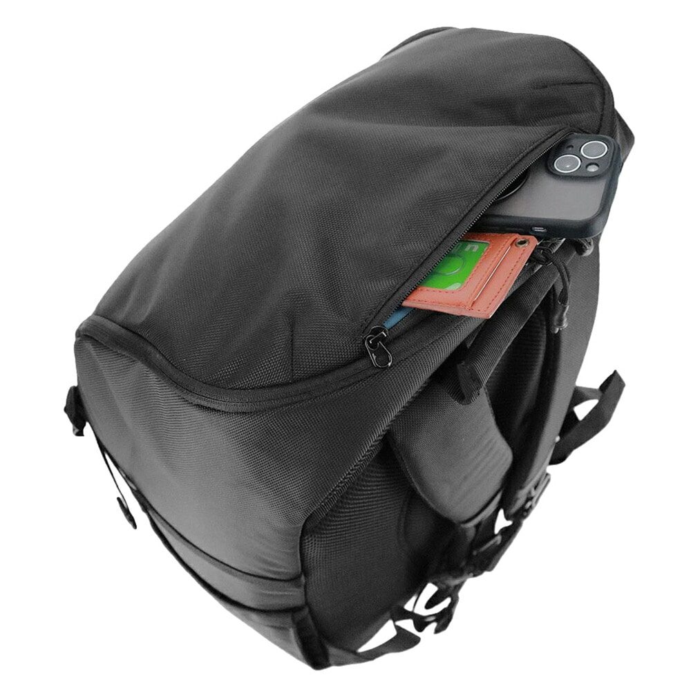 上部の浅めポケットは前持ちした際のスマホの出し入れにも便利。