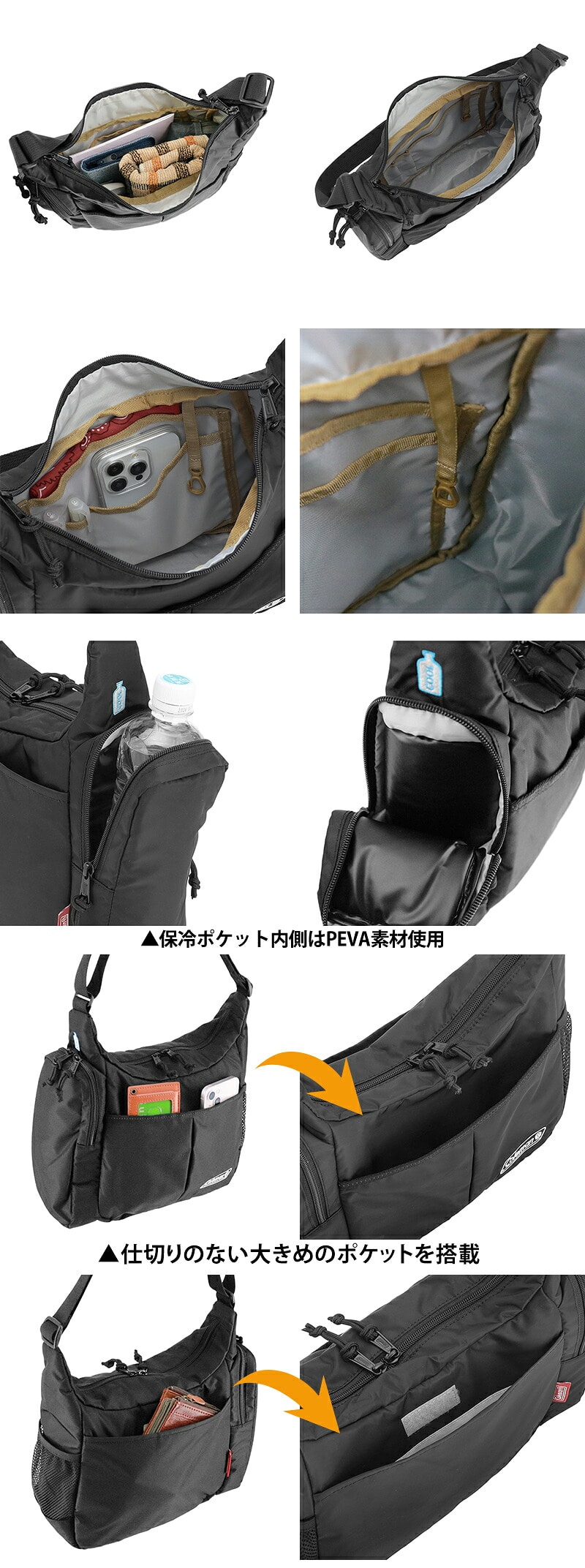 ・保冷ポケット内側はPEVA素材使用(500mlペットボトル収納可能)