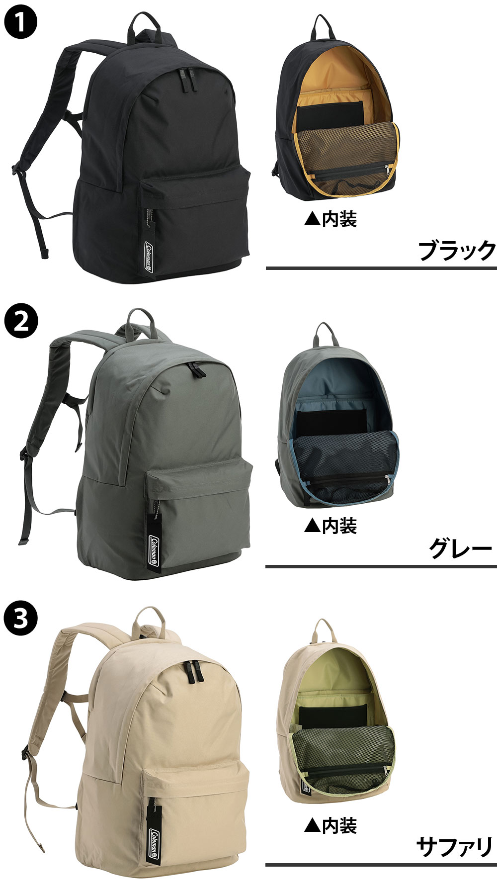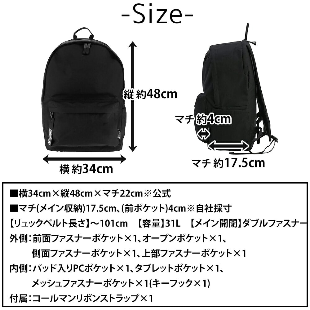 | 備考 | 【メイン開閉】ダブルファスナー 外側/ 前面ファスナーポケット×1 オープンポケット×1 側面ファスナーポケット×1 上部ファスナーポケット×1 内側/ パッド入りPCポケット×1 タブレットポケット×1 メッシュファスナーポケット×1(キーフック×1) 付属/ コールマンリボンストラップ×1 ・取り外し可能な可動式チェストベルト搭載 キーワード : リュック バックパック デイパック 31L 30L台 大容量 B4対応 通学リュック 高校生 大学生 通勤リュック 通勤 通学 部活 普段使い 旅行 1泊旅行 アウトドア タウンユース 新生活 入学祝い メンズ レディース 男女兼用 男性 女性 コスパ 1万円以下 PC収納 ノートPC ノートPC収納 タブレット収納 パッド入り チェストベルト 着脱可能 ポケット多め 収納力 軽量 ナイロン 撥水 耐久性 シンプル 無地 ストリート ブラック 黒 プレゼント ギフト ラッピング ラッピング無料 ビジネス 学生 ブランド ポイント消化 ニューバッグワカマツ ニューバックワカマツ | ||
