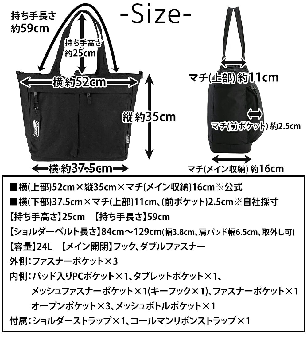 | 備考 | 【メイン開閉】フック、ダブルファスナー 外側/ ファスナーポケット×3 内側/ パッド入りPCポケット×1 タブレットポケット×1 メッシュファスナーポケット×1(キーフック×1) ファスナーポケット×1 オープンポケット×3 メッシュボトルポケット×1 付属/ ショルダーストラップ×1 コールマンリボンストラップ×1 キーワード : トートバッグ 2WAYバッグ ショルダーバッグ 24L A4対応 B4対応 通勤バッグ 通学バッグ 普段使い 旅行 タウンユース 新生活 入学祝い メンズ レディース 男女兼用 男性 女性 1万円以下 コスパ PC収納 タブレット収納 ボトルポケット 軽量 ナイロン 撥水 シンプル 無地 ストリート ワントーン ブラック 黒 プレゼント ギフト ラッピング ラッピング無料 ビジネス 学生 ブランド ポイント消化 ニューバッグワカマツ ニューバックワカマツ | ||