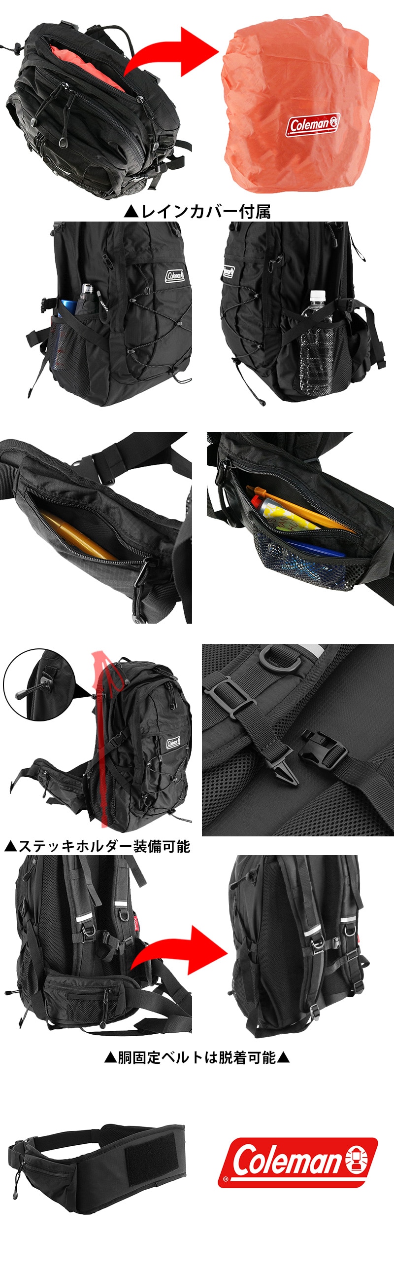 ・胴固定ベルトは脱着式で、タウンユースでは外してスッキリした使用が可能。
