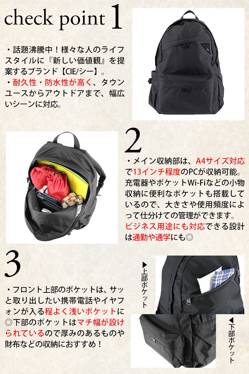 商品:シー バッグ リュックサック バックパック 防水 撥水 CIE フロウ デイパック 18L A4サイズ 022100 メンズ レディース