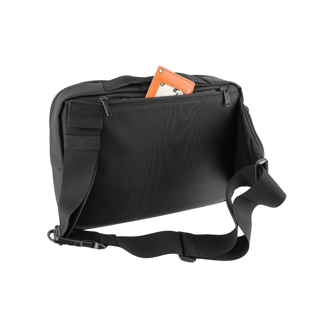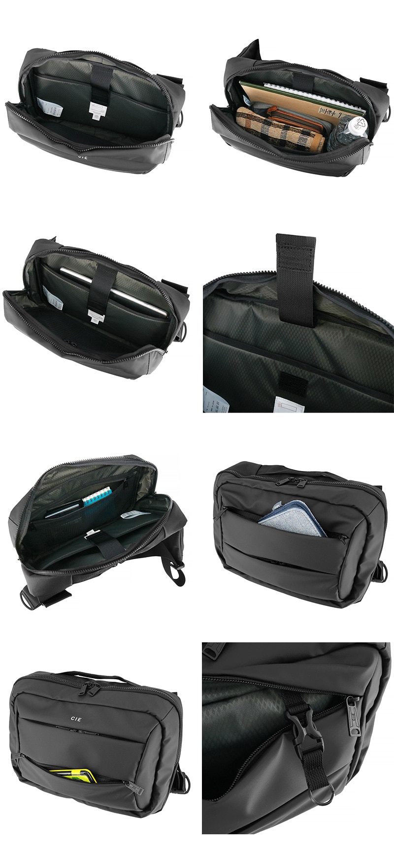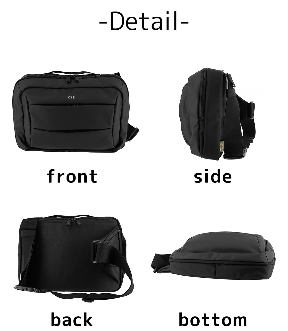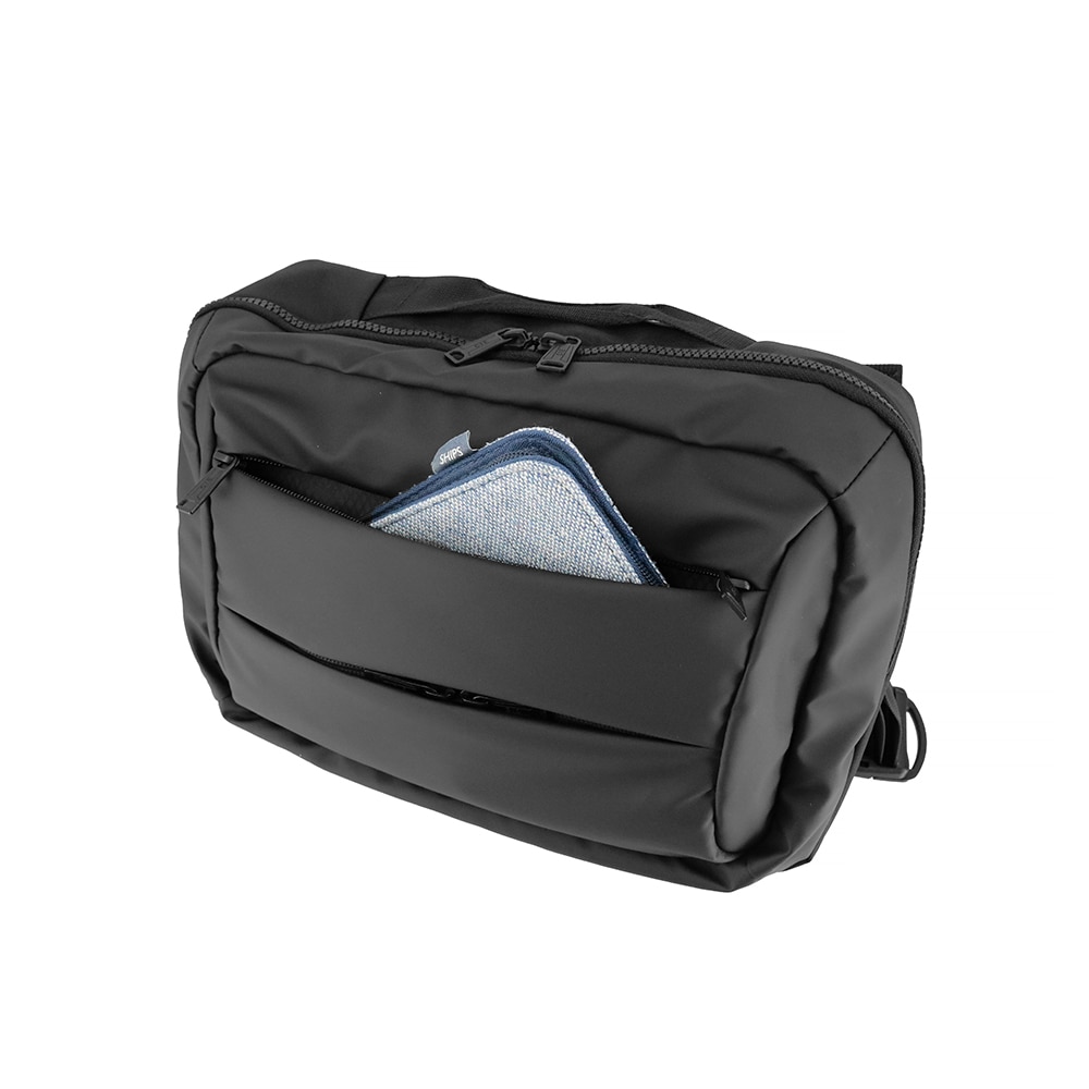 前面にはファスナーポケット、サイドにはイヤホンなど収納可能なファスナーポケットを配しております。