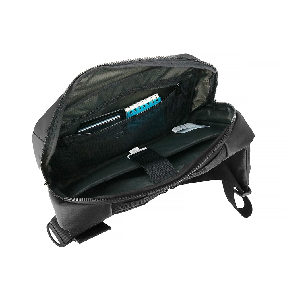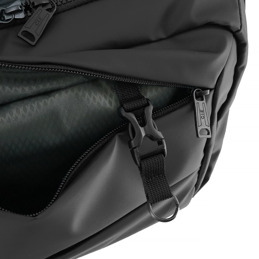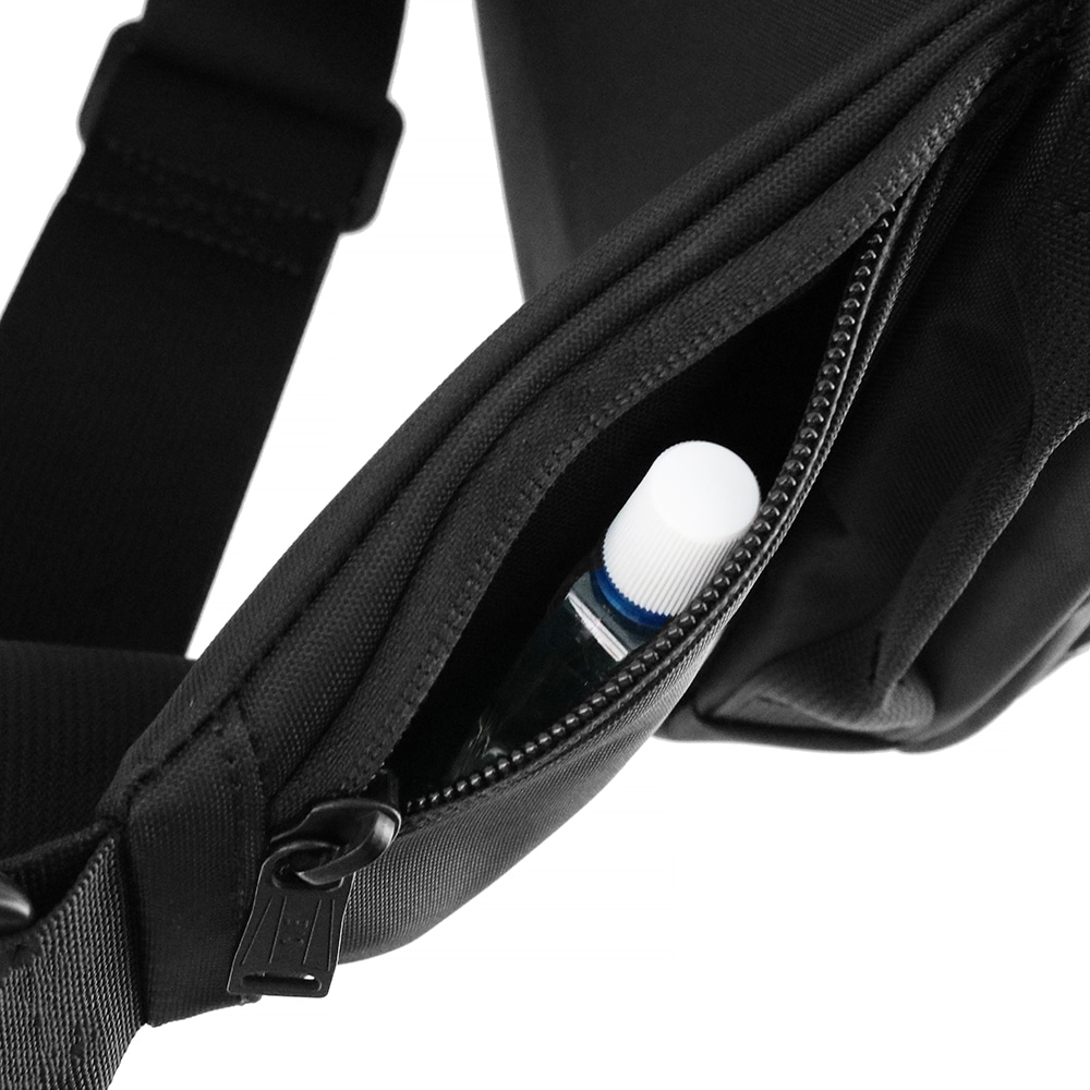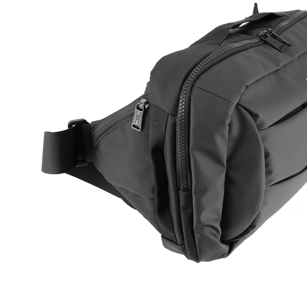 前面にはファスナーポケット、サイドにはイヤホンなど収納可能なファスナーポケットを配しております。