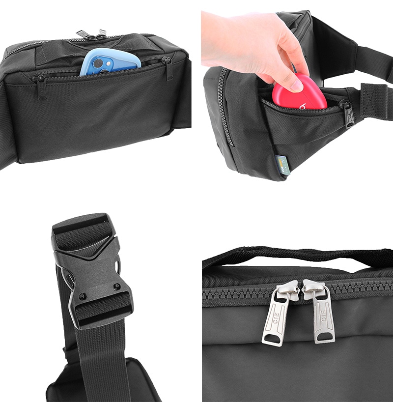 前面にはファスナーポケットを1ヶ所、またサイドにはBluetoothイヤホンなど収納可能な立体ファスナーポケットを配しております。