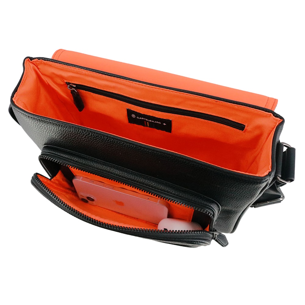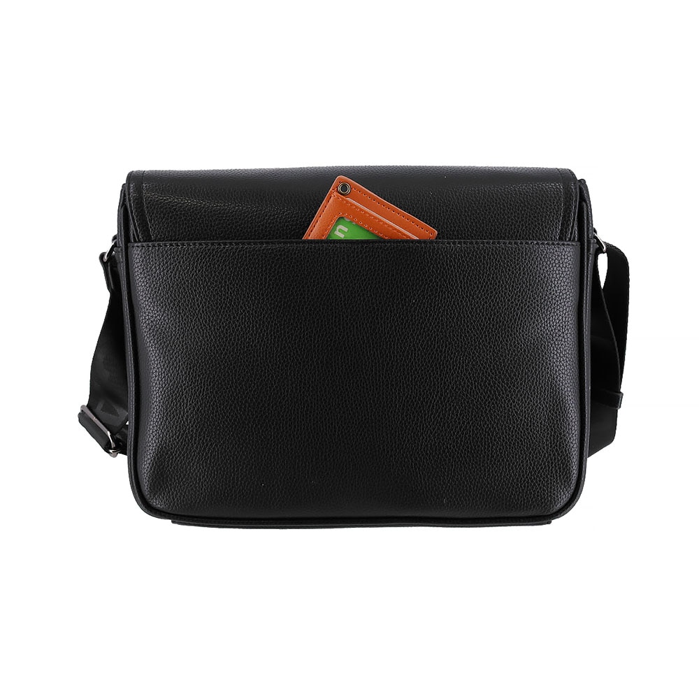 表面は滑らかで程よい光沢感があり、フラップや立体ポケットのデザインを引き立てます。
