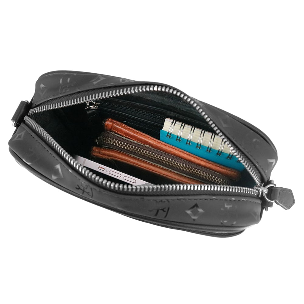 シンプルながら光沢のあるモノグラム柄がアクセントになり、日常のスタイルにさりげなく華やかさを添えます。