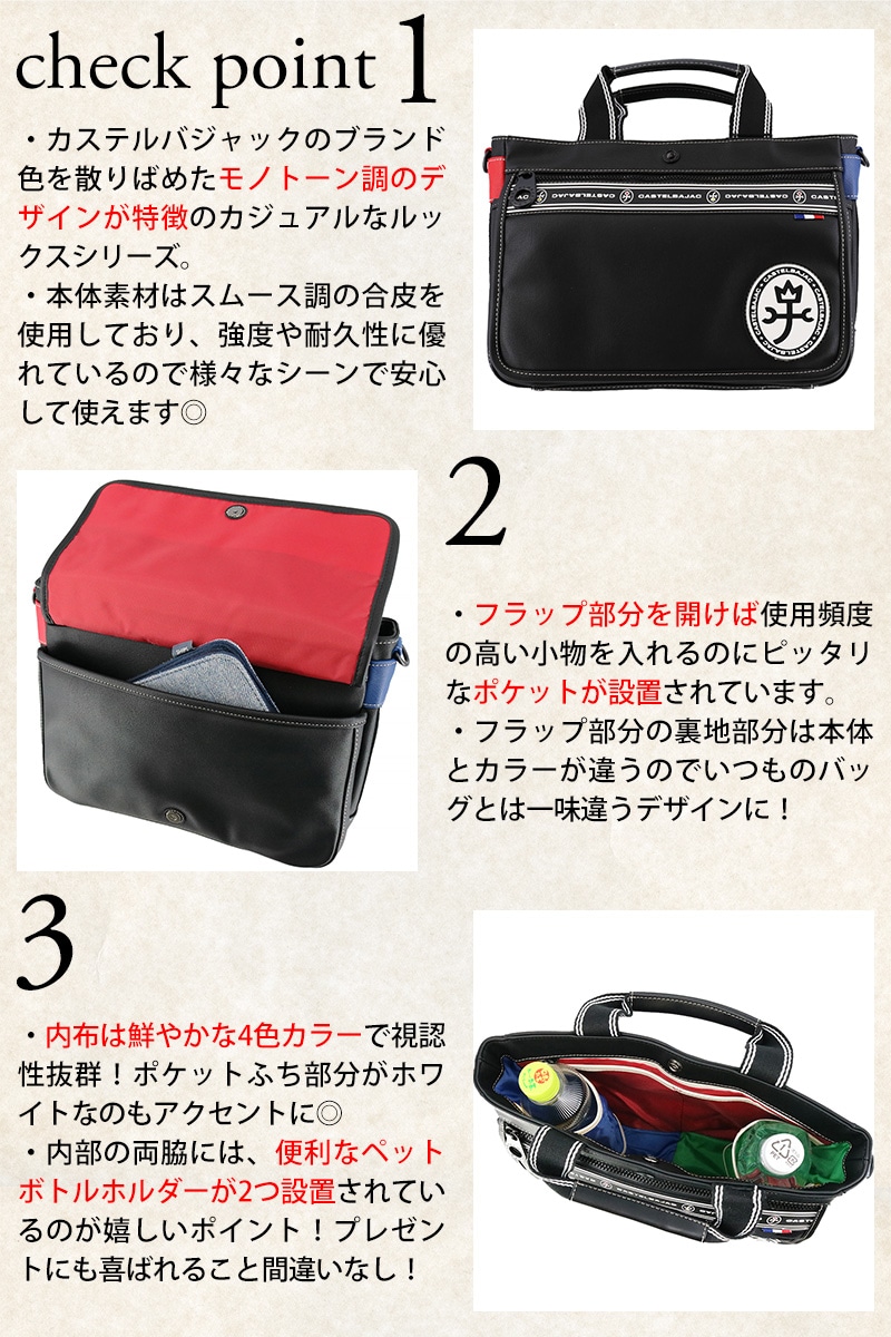 ブランドの4原色をポイントで使用し、節々にブランドを表現した、カステルバジャック好きにピッタリのカジュアルバッグ『ルックス』の2way仕様のトートバッグ。