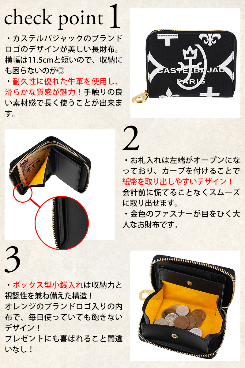 カステルバジャックのモノグラムを大胆にプリントした、長財布です。