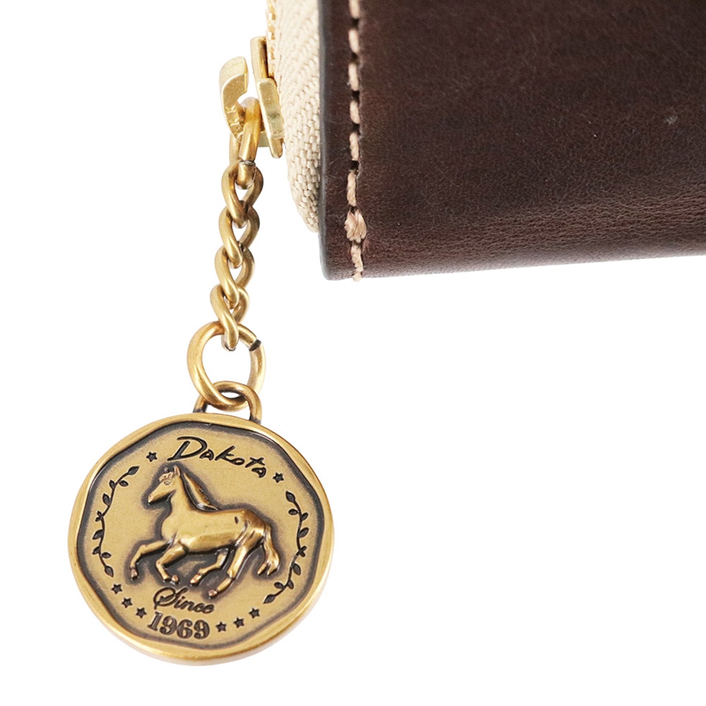 「幸せを運ぶ馬」と「幸せを受け止める上向きの馬蹄」が刻まれたコイン風チャームにダコタの想いが込められています。