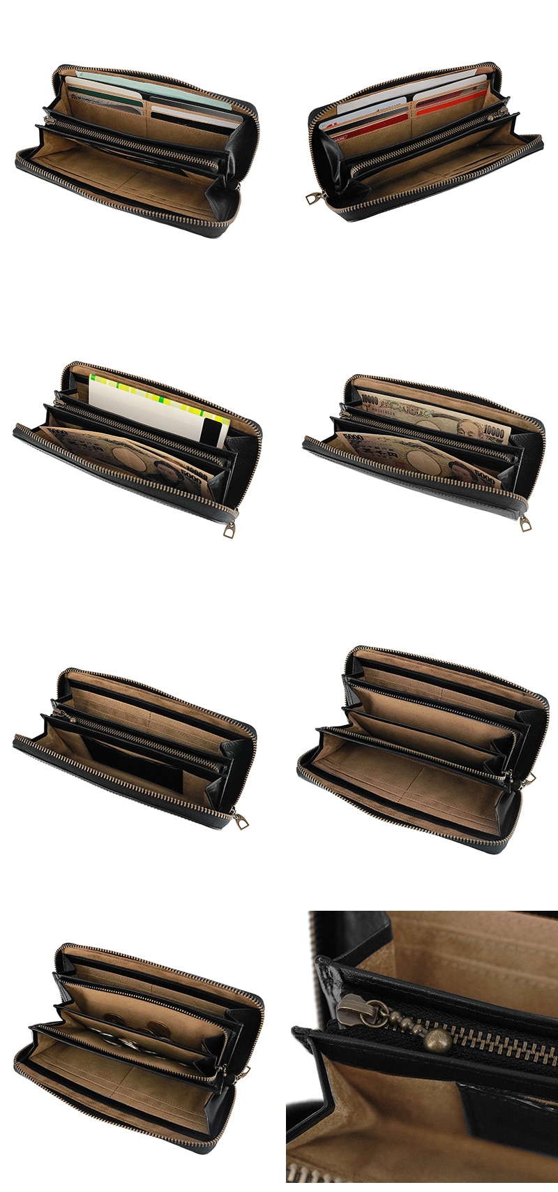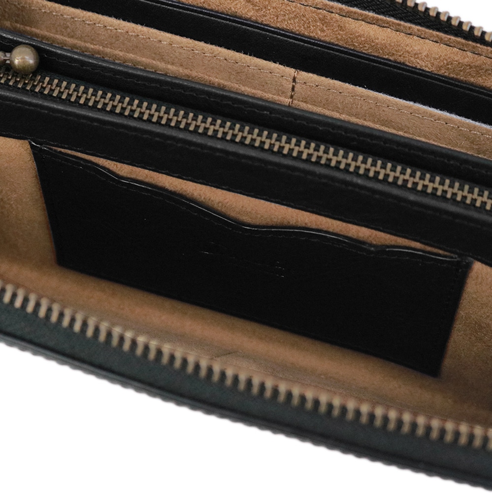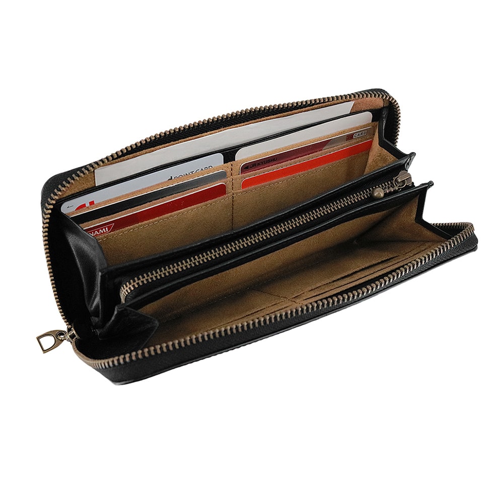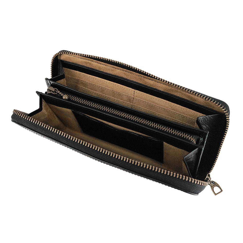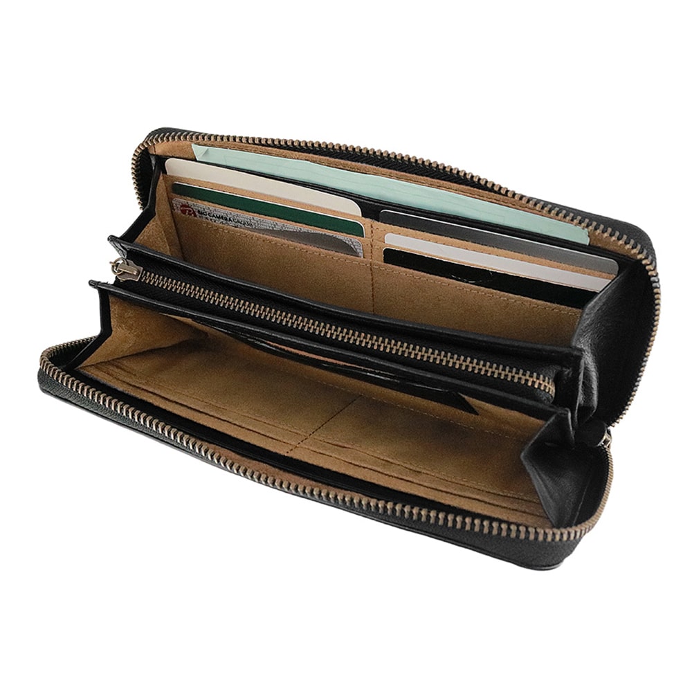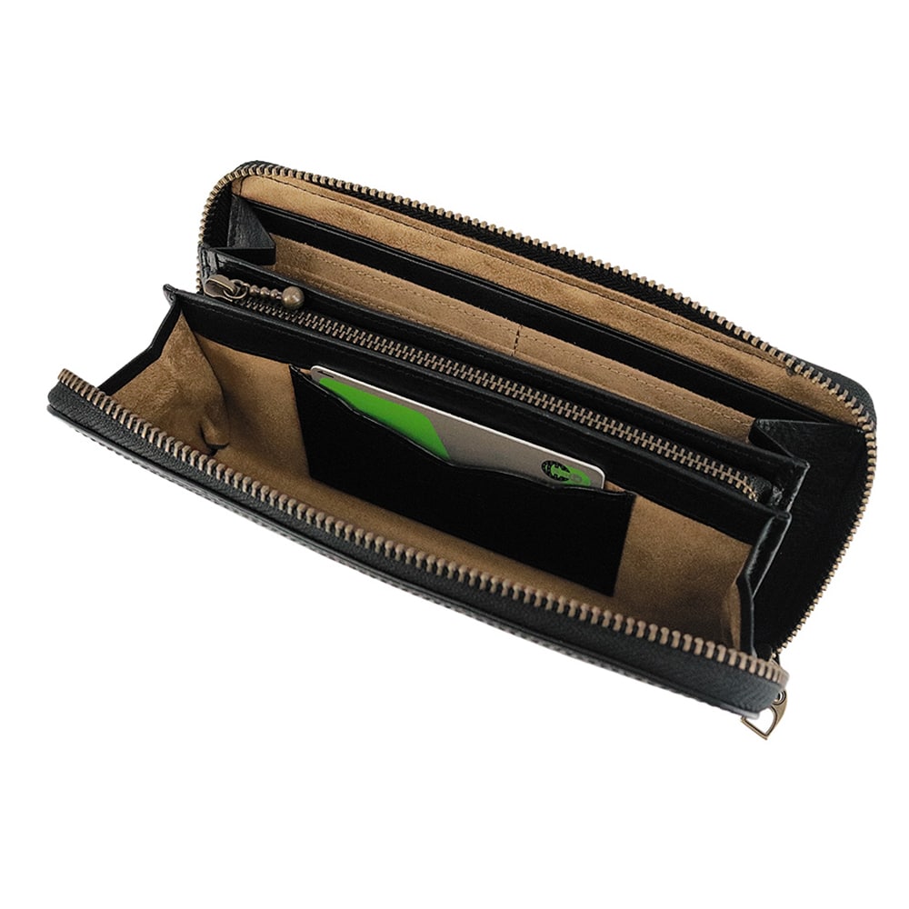 カードも紙幣も硬貨もきっちり仕分けできるラウンドファスナー仕様の長財布。