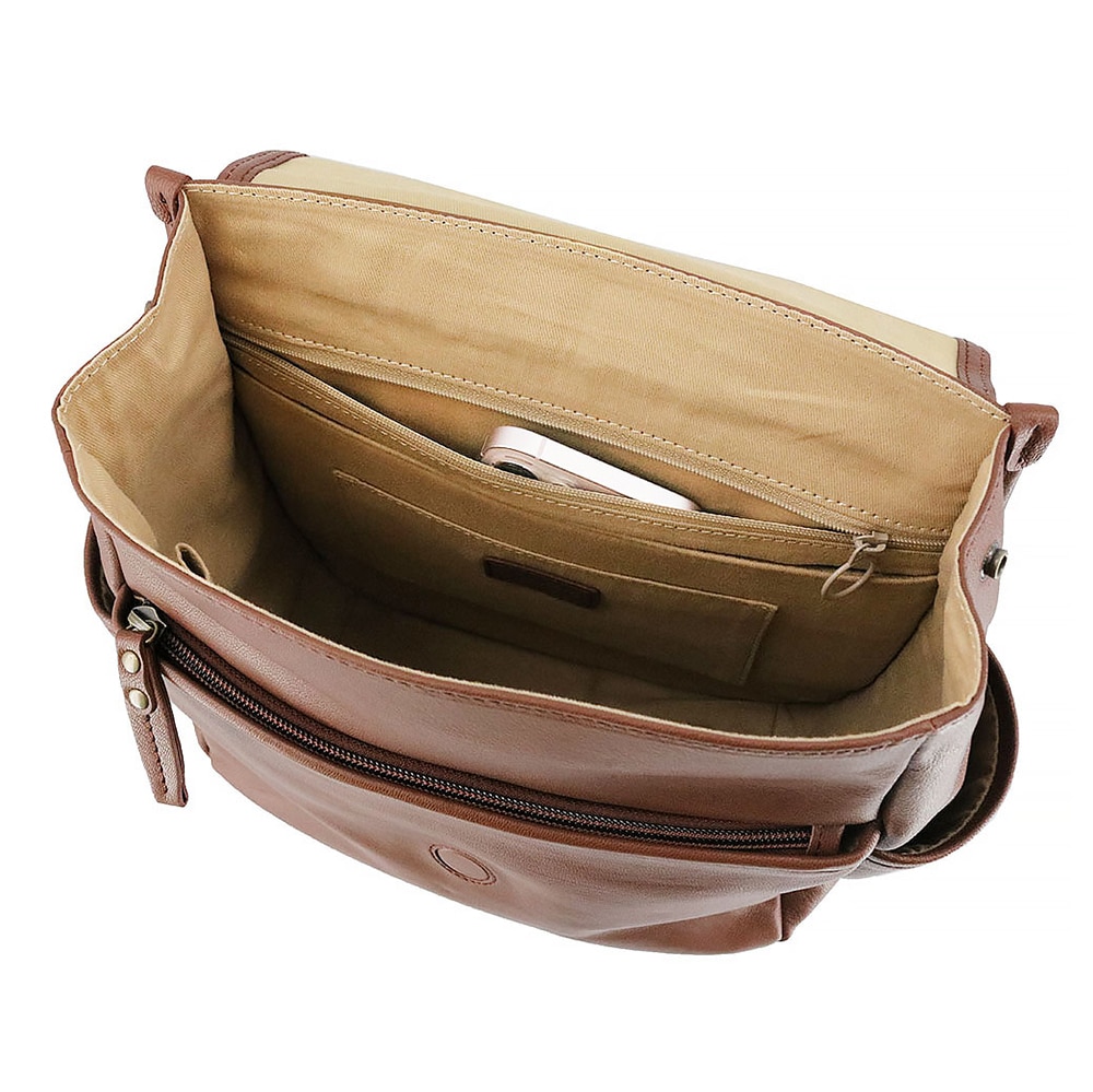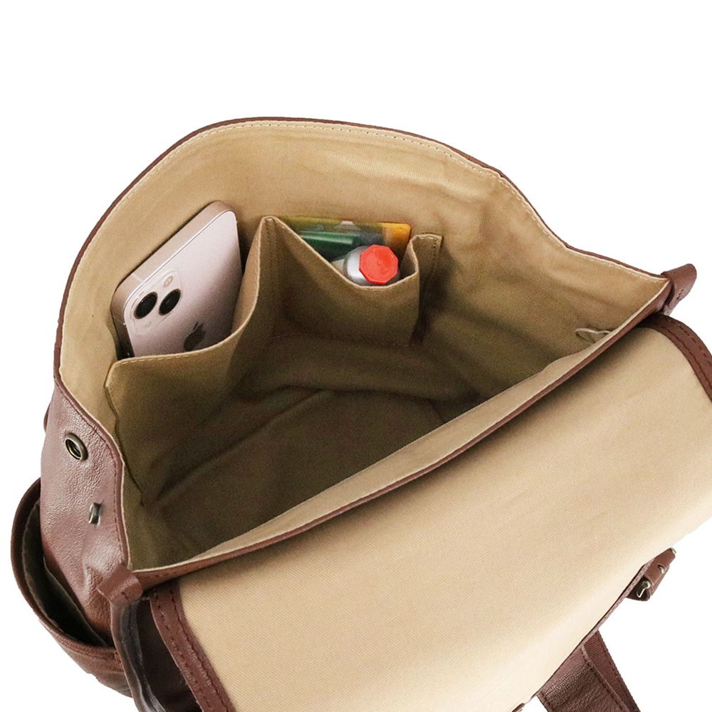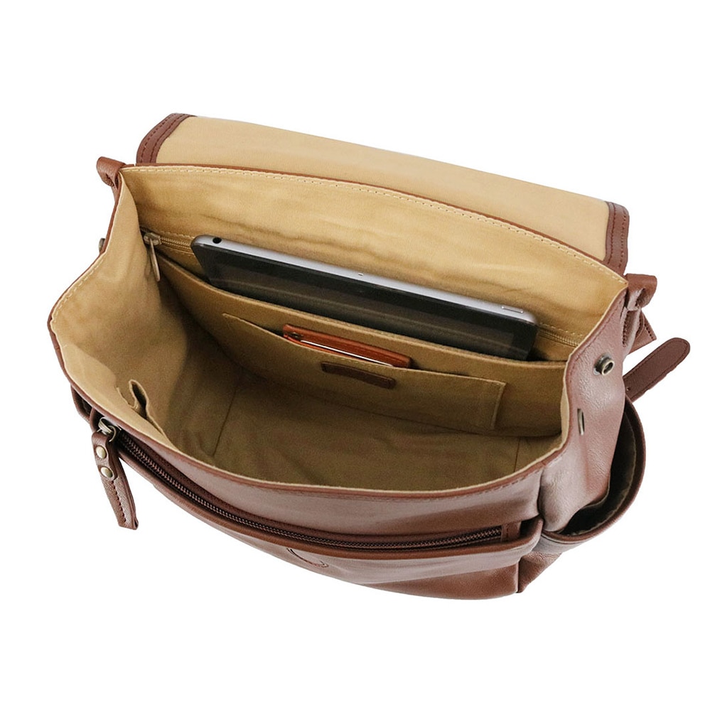 大きなフラップで開閉ができ、タブレットや資料なども収納しやすいです。