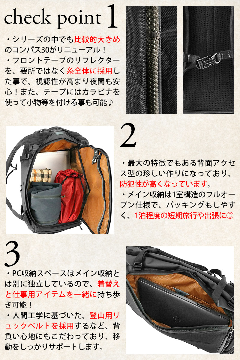 どんなスタイル・シーンにも合うシンプルなフォルムと、人間工学に基づいたトレイル用リュックベルトを搭載した【コンパス30】。