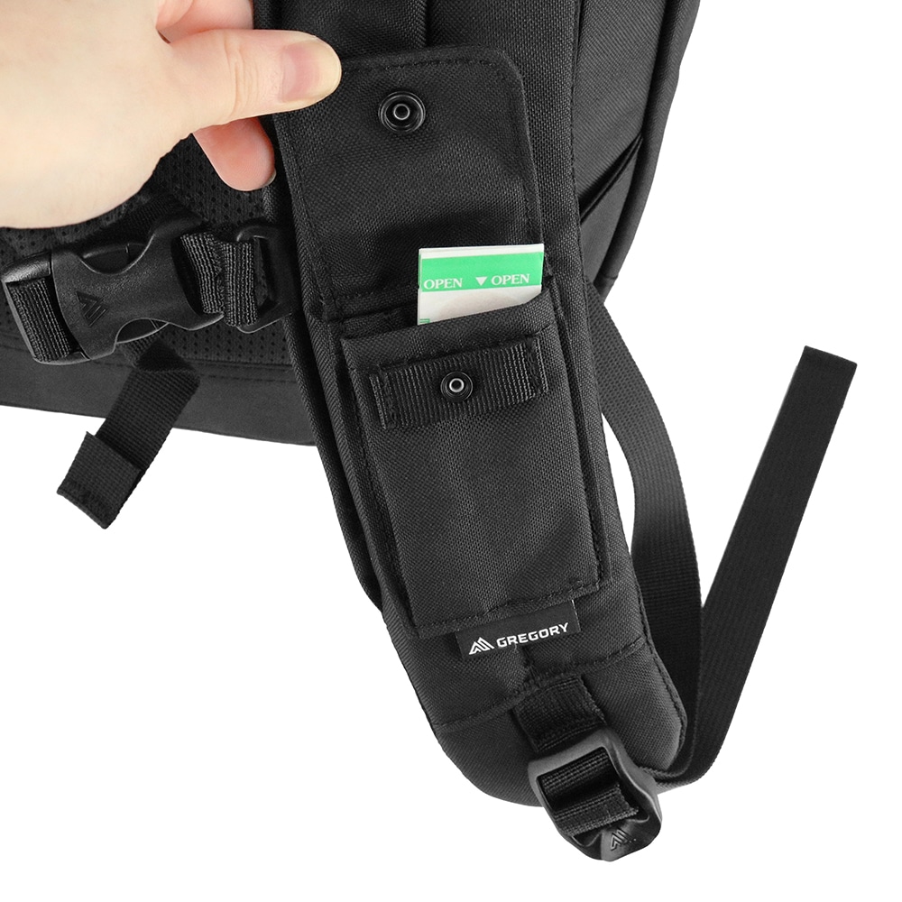 ■リュックベルトにアタッチメント用のDカンとミニポケットを配置。
