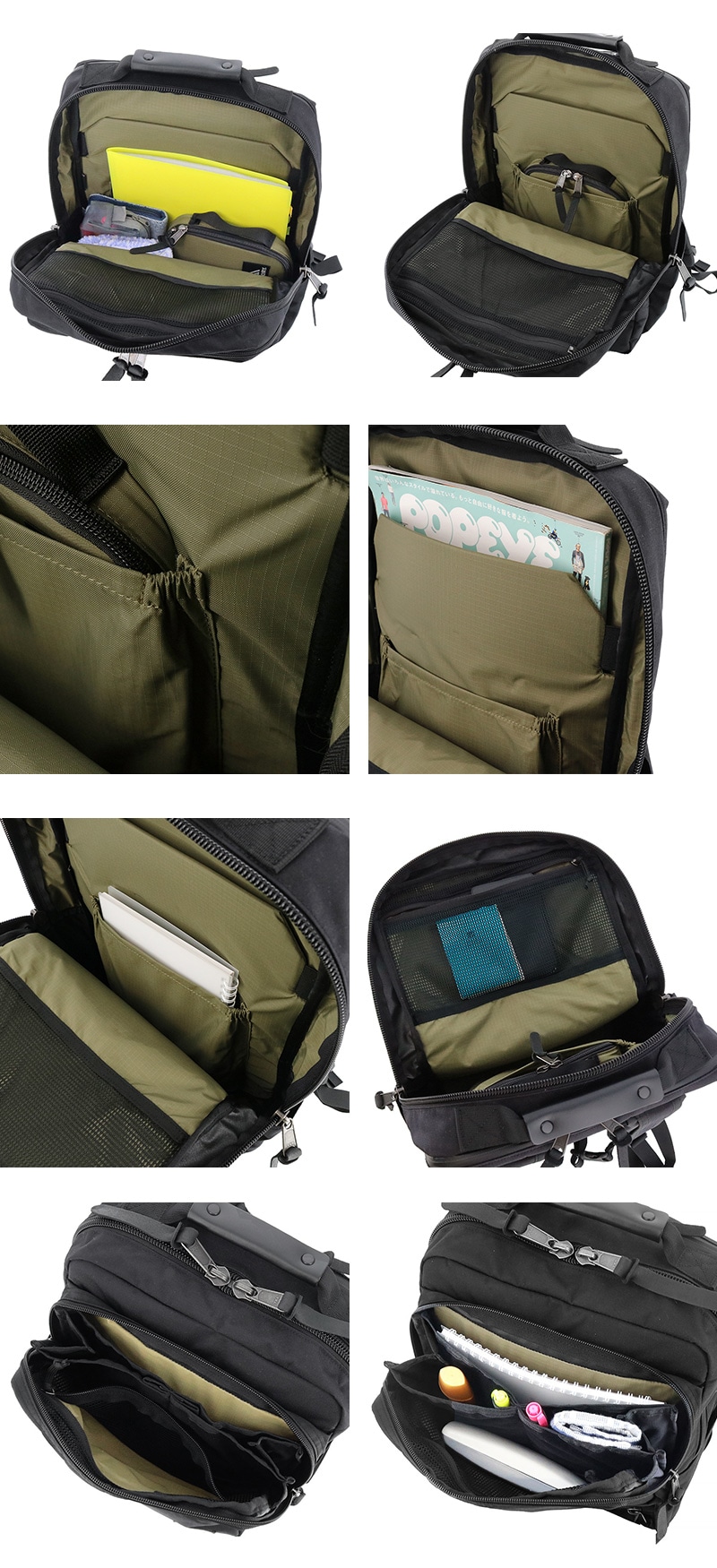 上ファスナーポケット×1(中オープンポケット×1、中ファスナーポケット×1(メッシュ)、仕切りポケット×2、ペン挿し×2)