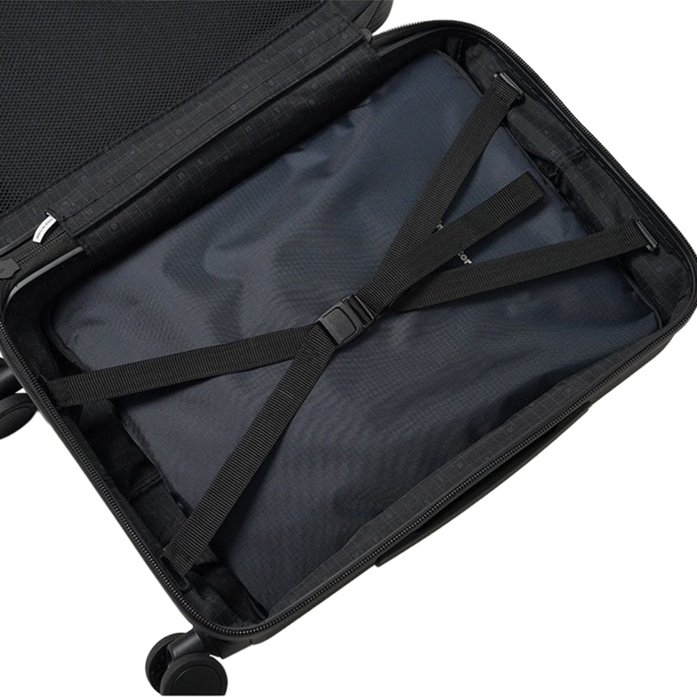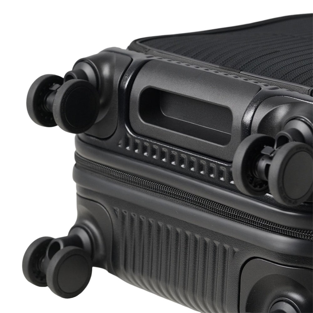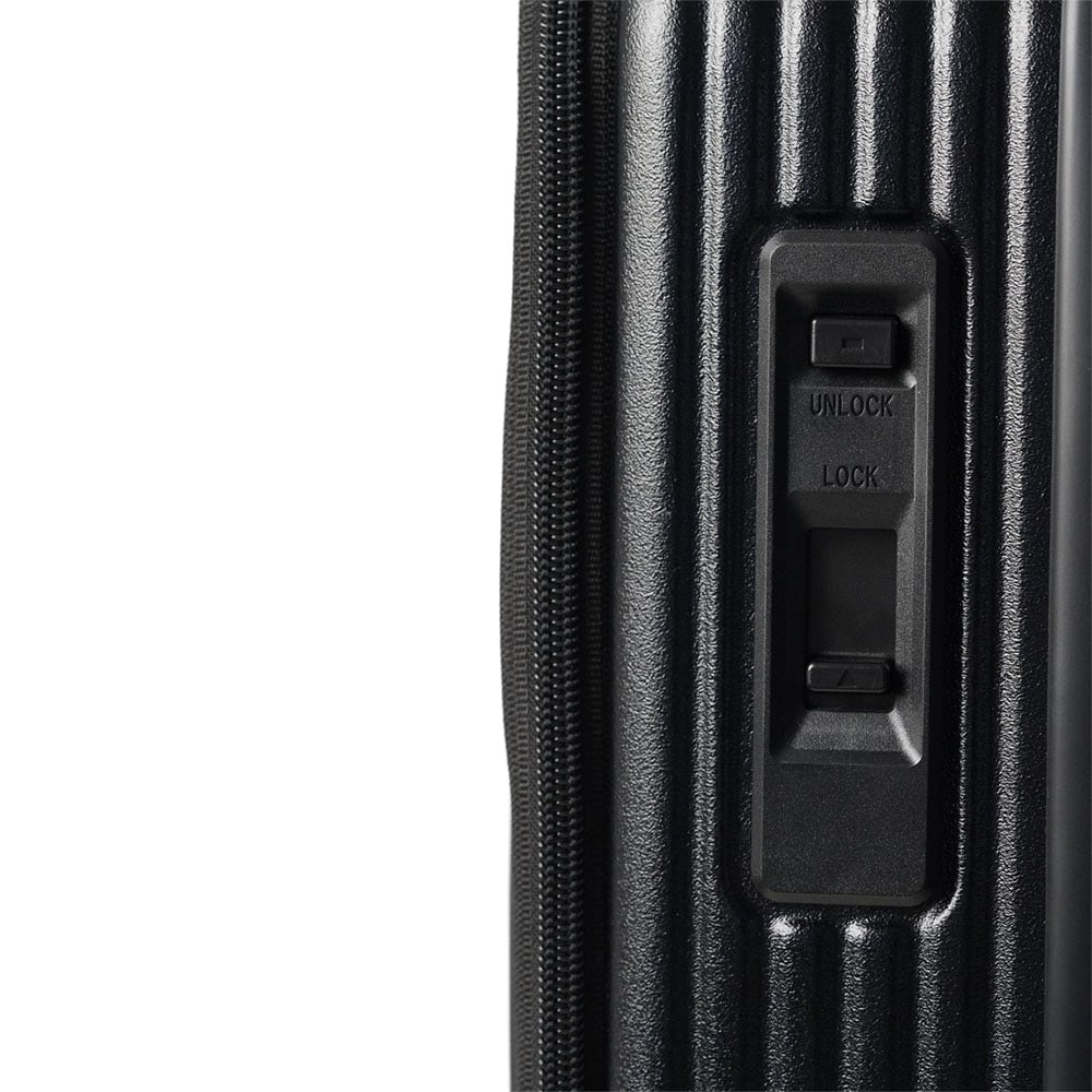 異なる素材感の組み合わせとベーシックなボディーカラーにより、シックで落ち着いた雰囲気のスーツケースに。