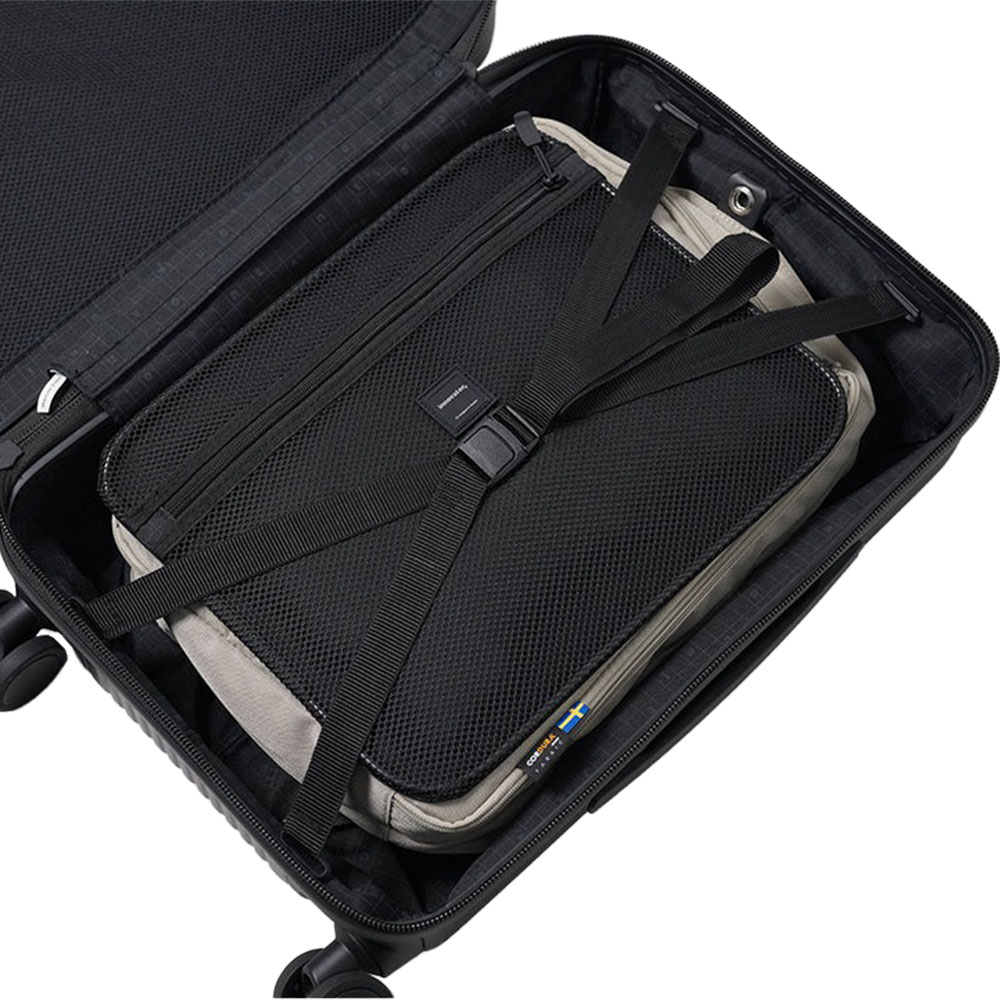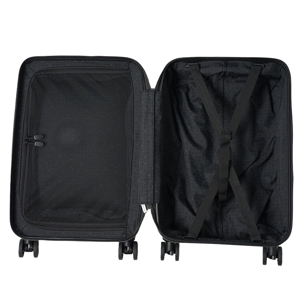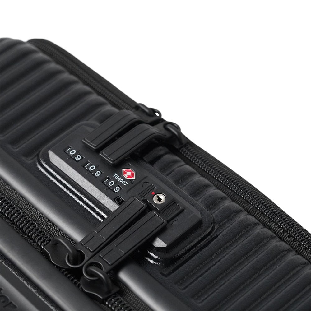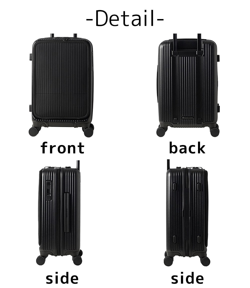 異なる素材感の組み合わせとベーシックなボディーカラーにより、シックで落ち着いた雰囲気のスーツケースに。