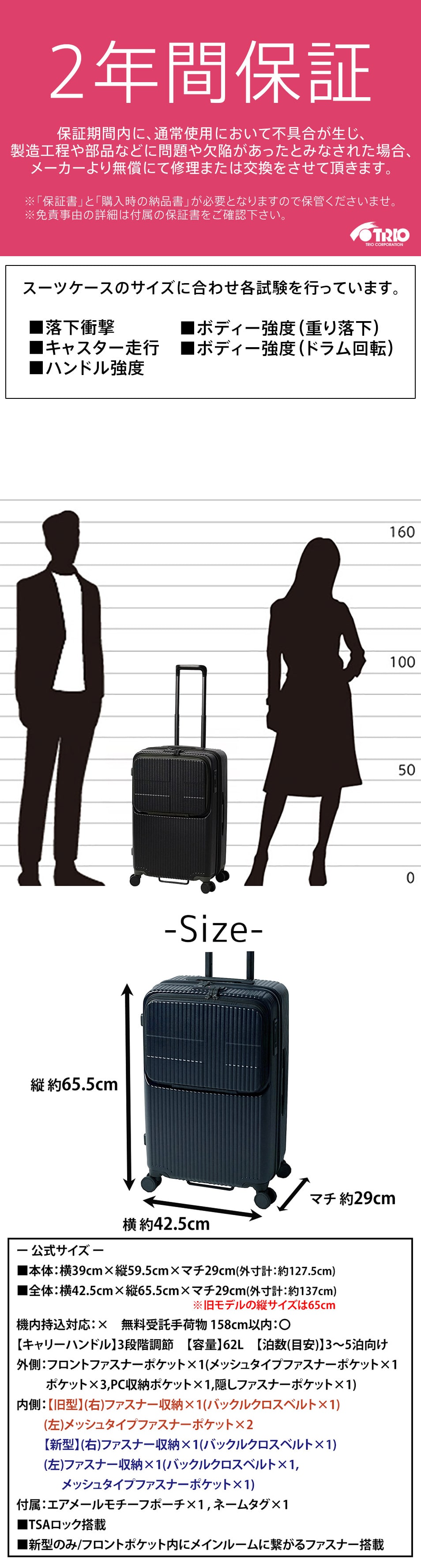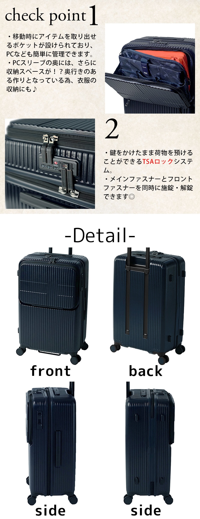 新幹線・バスなど乗り物移動で使いやすい トップオープンポケット+ブレーキキャスター付き のミドルサイズのスーツケース。荷物多めの旅行に最適。