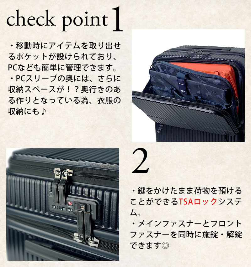 新幹線・バスなど乗り物移動で使いやすい トップオープンポケット+ブレーキキャスター付き のミドルサイズのスーツケース。荷物多めの旅行に最適。