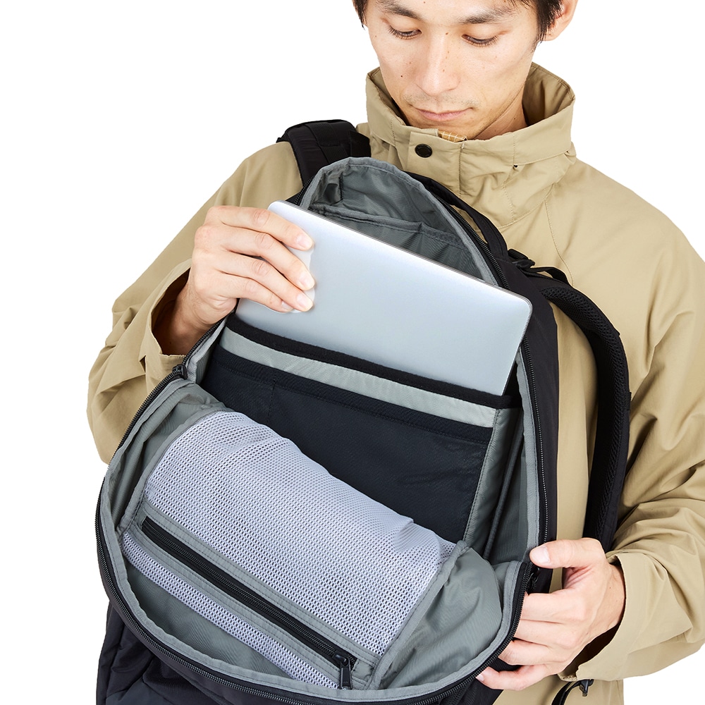 シンプルなデザインながら、旅行や日常使いに便利な充実の機能を備えた中型リュックサック(32L)。