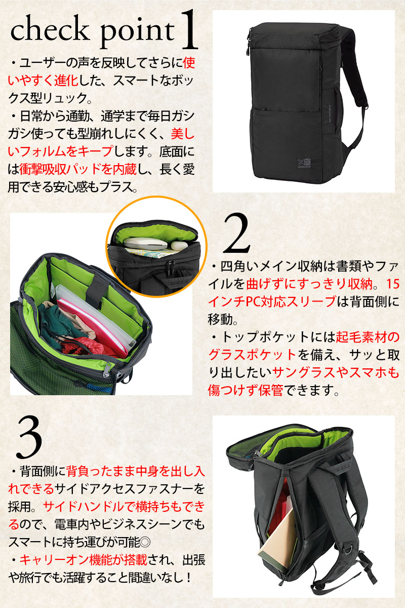 シンプルな外見に詰められた豊富なポケットと充実した機能性はそのままに、キャリーオン機能などが追加されるなど、普段使いはもちろん、ビジネスシーンでも活躍。