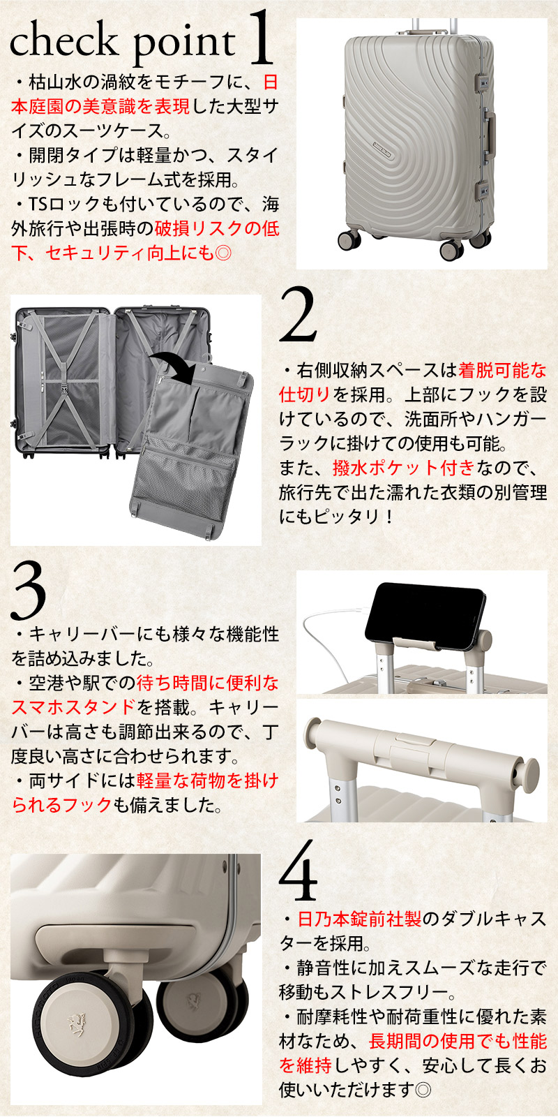 キーワード: 保証付き 4輪 TSロック 静音 滑らか 多段階キャリーバー メンズ レディース シンプル 和風 きれい かわいい 人気 男性 女性 ビジネス 宿泊 出張 旅行 大サイズ 5泊 6泊 7泊 1週間 一週間 10泊 フレーム 日乃本錠前社製キャスター TSロック スーツケース キャリーケース 国内旅行 国外旅行 海外 長期 学生 ブランド ポイント消化 ニューバッグワカマツ ニューバックワカマツ