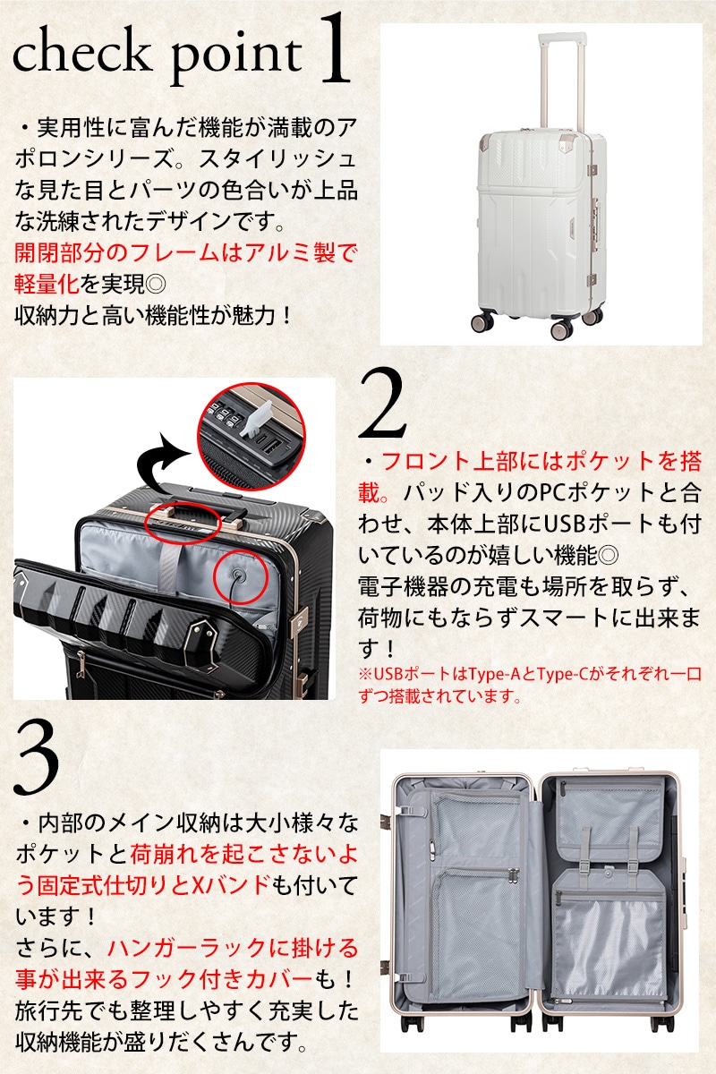 キーワード: 保証付き 4輪 ダイヤルロック 静音 滑らか USBポート付き スマホスタンド搭載 多段階キャリーバー メンズ レディース シンプル 無地 きれい かわいい かっこいい 人気 男性 女性 ビジネス 宿泊 出張 旅行 中型 3泊 4泊 6泊 フレームタイプ 日乃本錠前社製キャスター(日本製) スーツケース キャリーケース 国内旅行 海外旅行 長期 学生 ブランド ポイント消化 ニューバッグワカマツ ニューバックワカマツ
