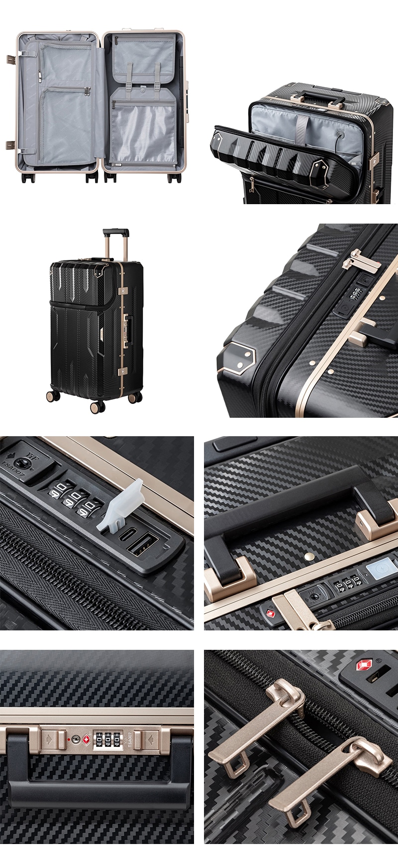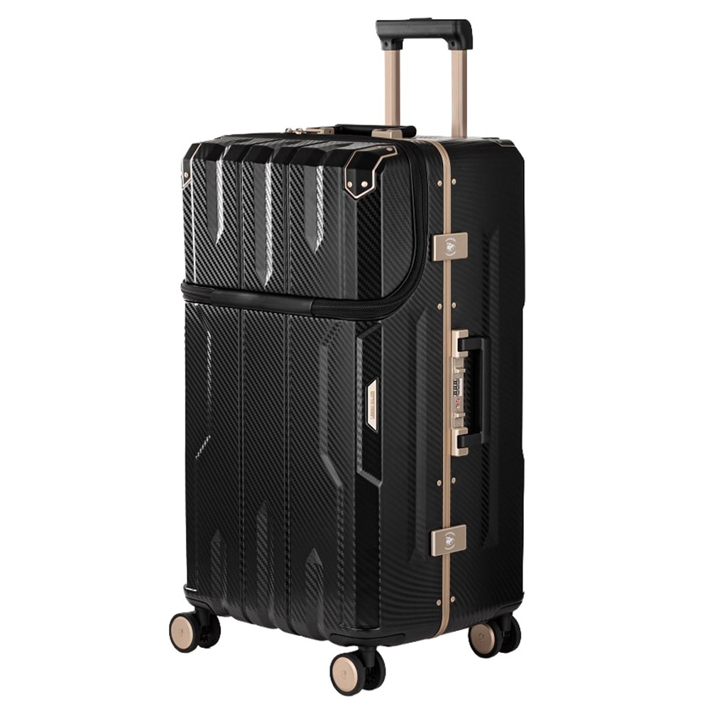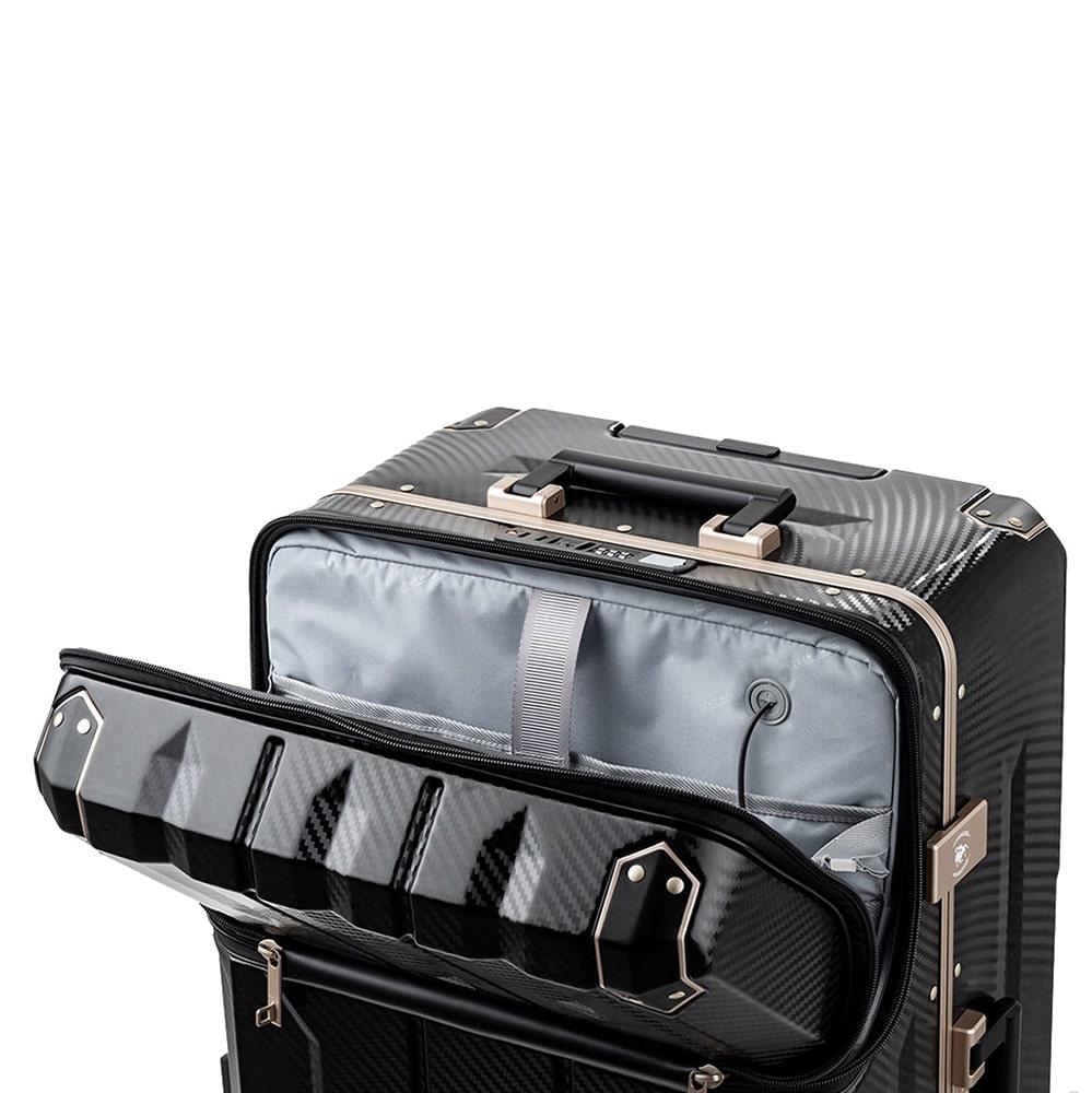 出し入れに便利なフロントオープンに、静音性の高い日乃本錠前社製ストッパー付きダブルキャスター搭載の多機能スーツケース。