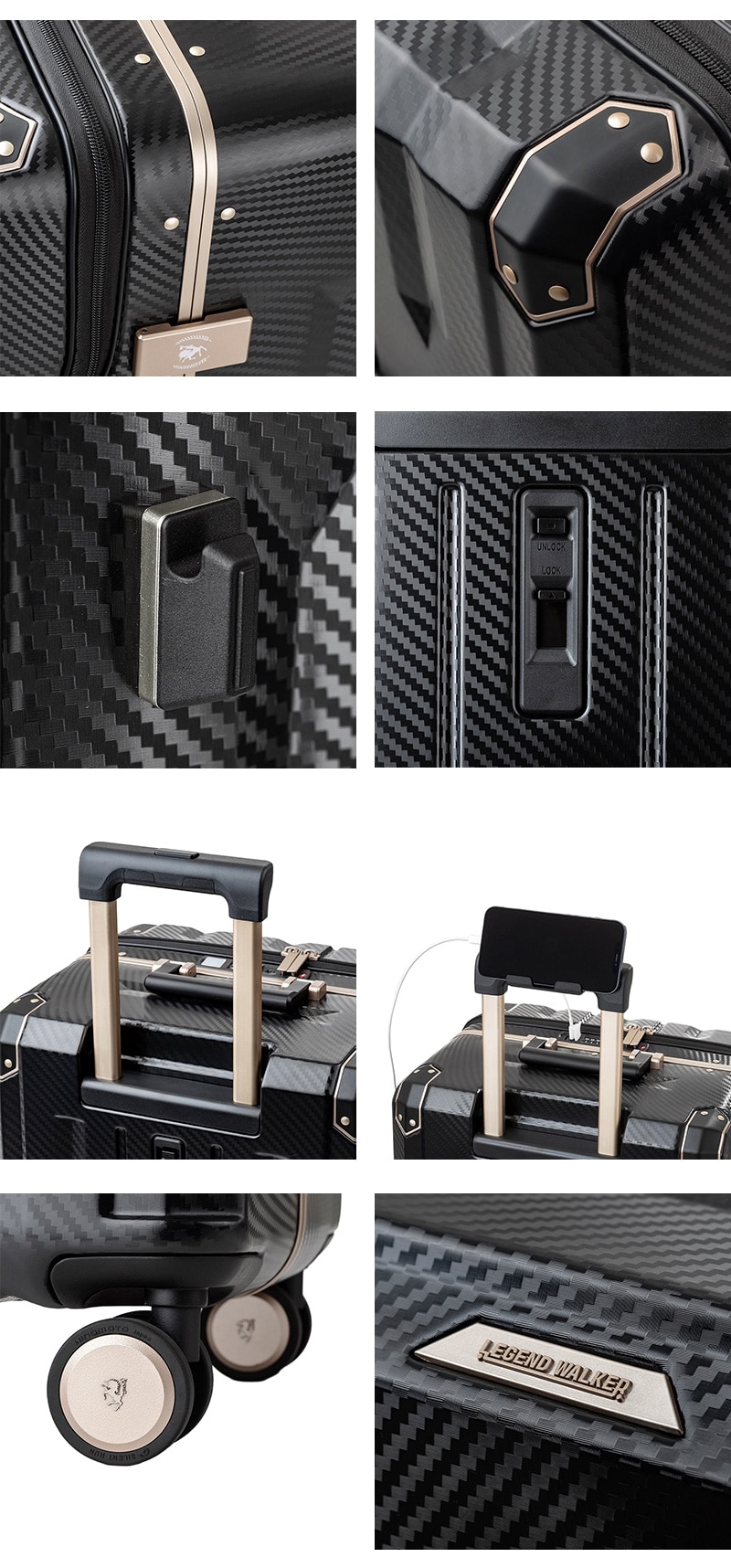 さらに、衝撃に強いアルミニウム製のコーナーパッドを装備。移動時やケースを預けた際の衝撃からボディを守ります。