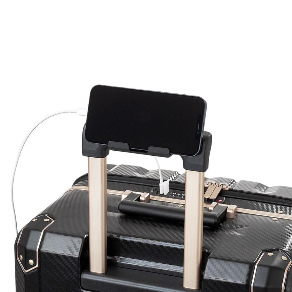 ・スマートフォンを立て掛けられるスタンド付きのキャリーバー。