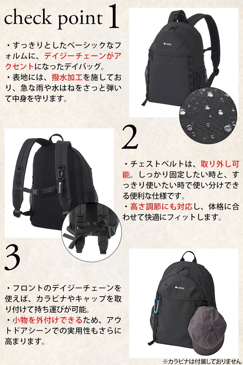 フロント部分には、デザインのアクセントにもなるデイジーチェーンを搭載。カラビナでマグカップなどの吊り下げにも活躍します。