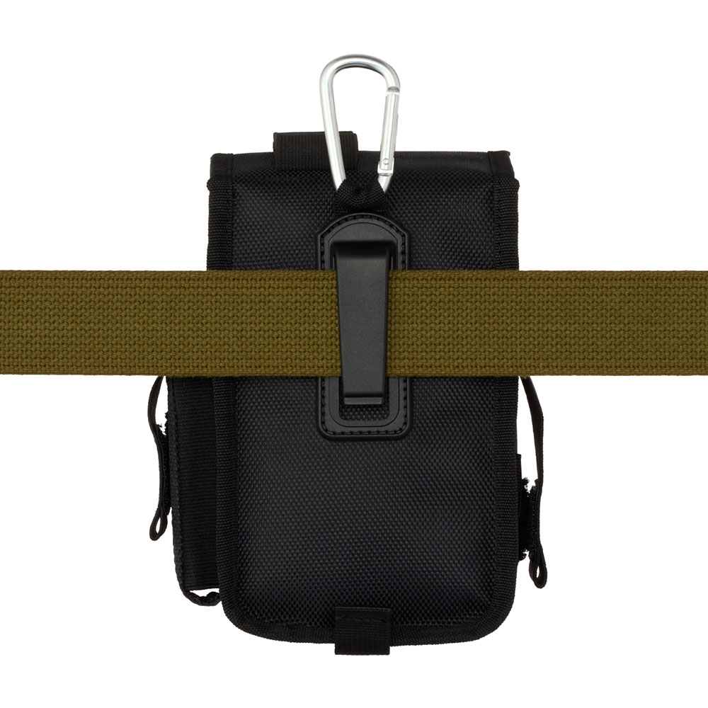 カラビナとベルト用クリップ標準搭載のため、さまざまなところに簡単着脱が可能。