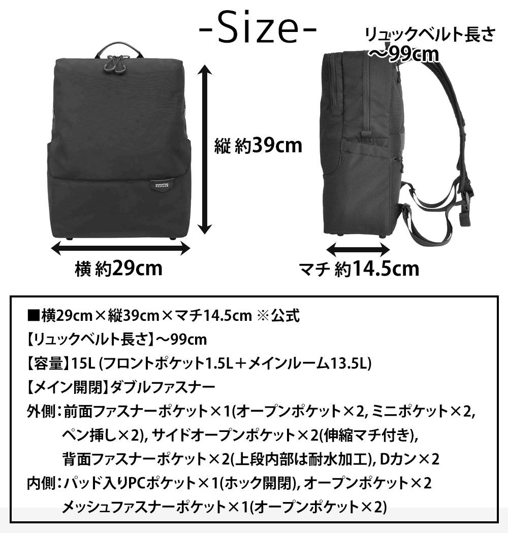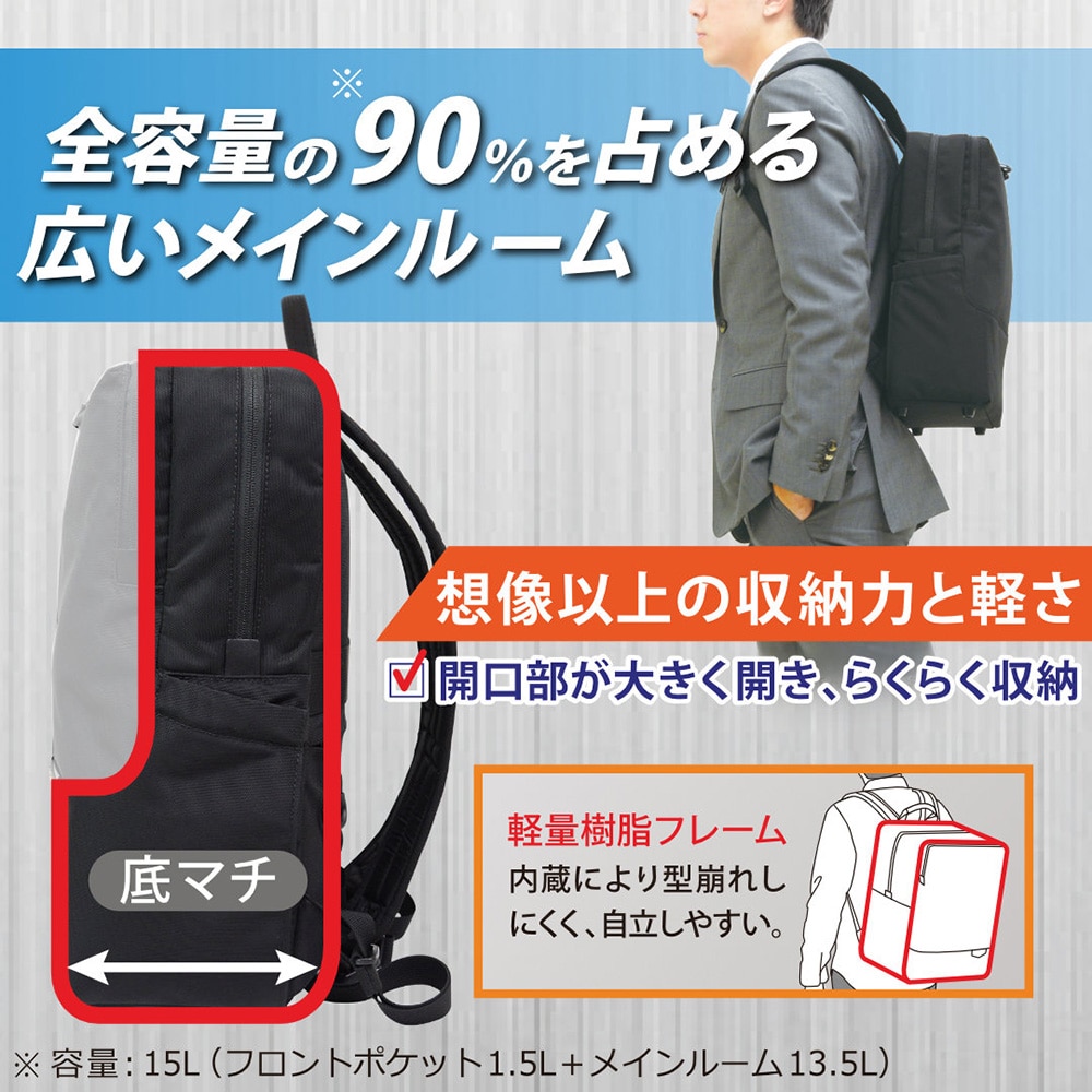 【容量】15L (フロントポケット1.5L+メインルーム13.5L)